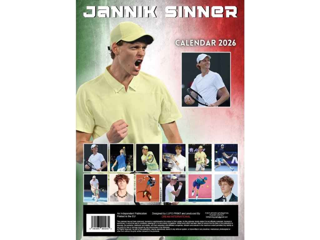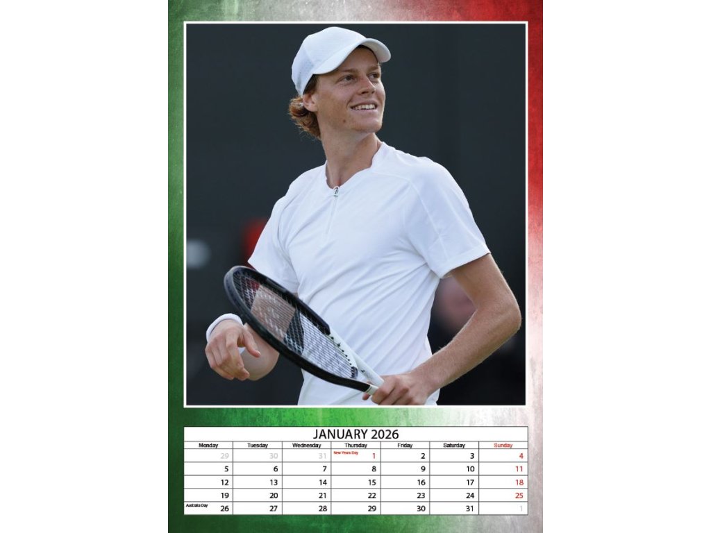 Oficiální produkt - exklusivní dvanáctiměsíční nástěnný kalendář na rok 2026 s fotografiemi populárního tenisového hráče Jannika Sinnera.