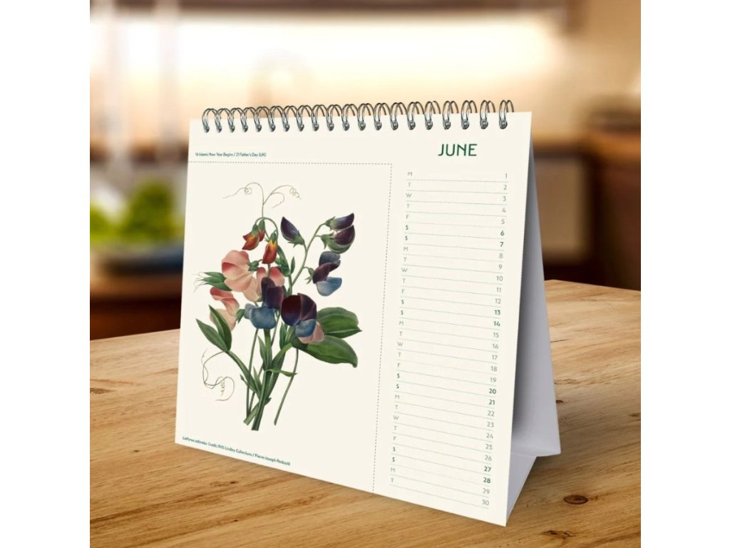 Dvanáctiměsíční otáčecí stolní kalendář v kroužkové vazbě s měsíčními listy a botanickými obrázky květin. Stránka každého měsíce má perforovaný okraj, takže ji lze snadno odstranit a vytvořit z ní pohlednici, kterou si můžete ponechat nebo poslat příteli.