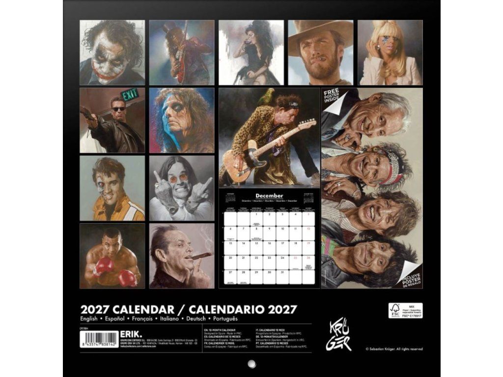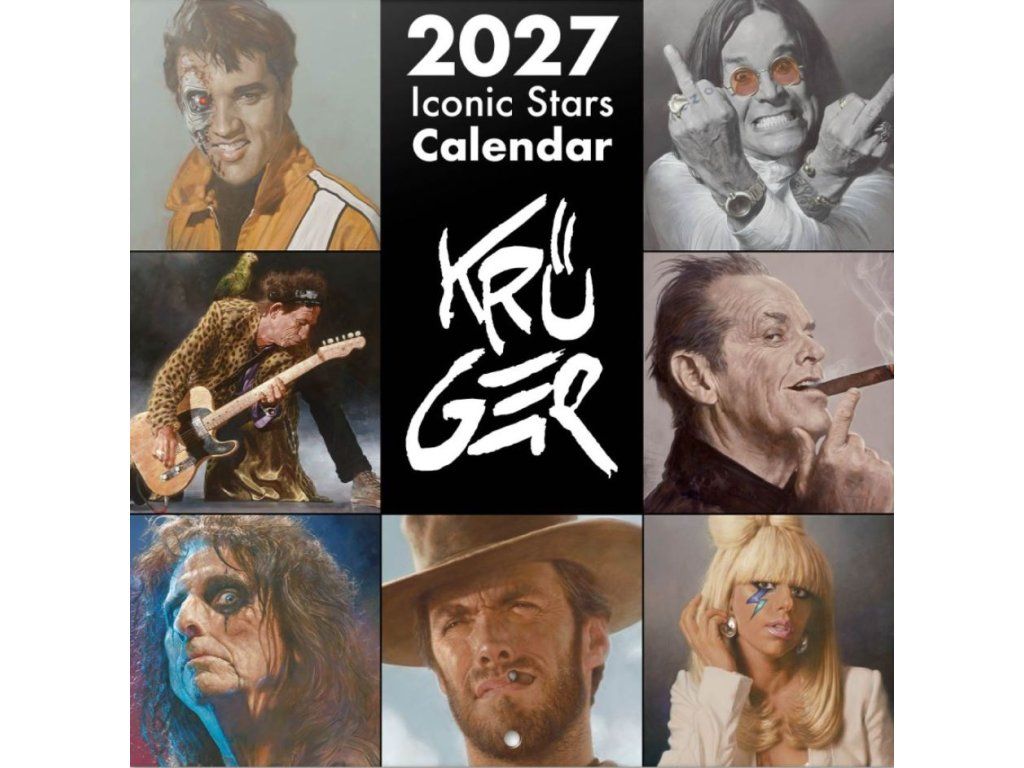 Nástěnný kalendář na rok 2027 představuje tvorbu světoznámého německého karikaturisty a malíře Sebastiana Krügera. Krüger je proslulý svým stylem "New Pop Realism", ve kterém mistrně kombinuje hyperrealistické detaily s groteskní nadsázkou, aby zachytil pravou esenci osobnosti dané hvězdy.