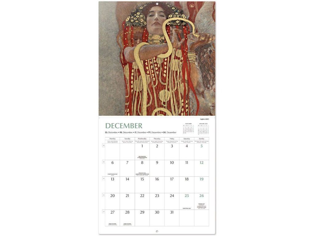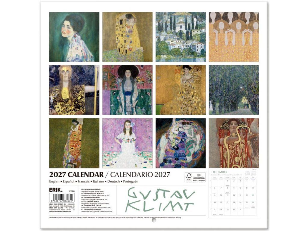 Oficiální produkt - nástěnný kalendář na 16 měsíců a rok 2027 s licencí na fotografie obrazů Gustava Klimta.