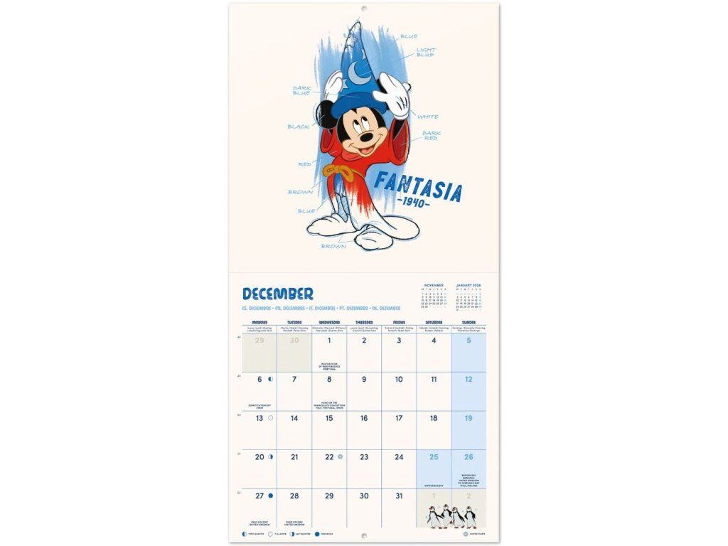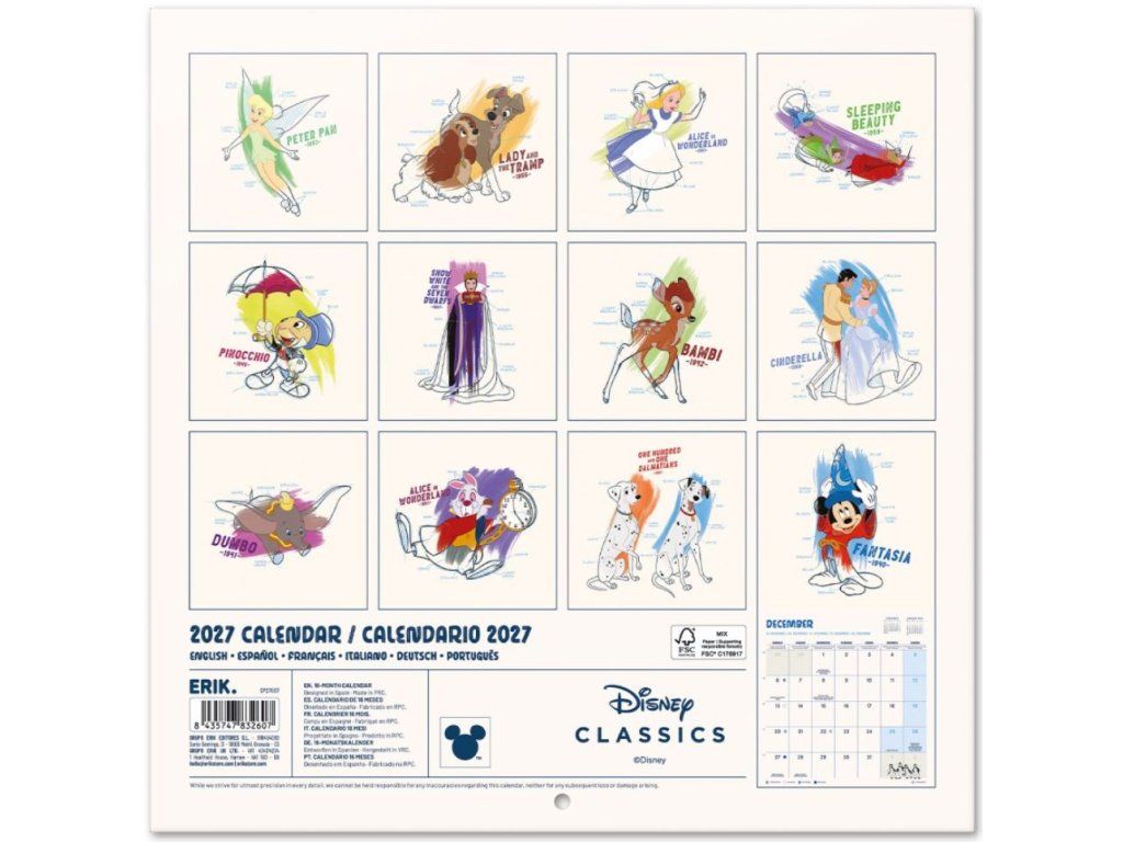 Oficiální produkt - nástěnný kalendář na rok 2027 z katalogu výrobků s grafikou animovaných filmů studia Walt Disney.