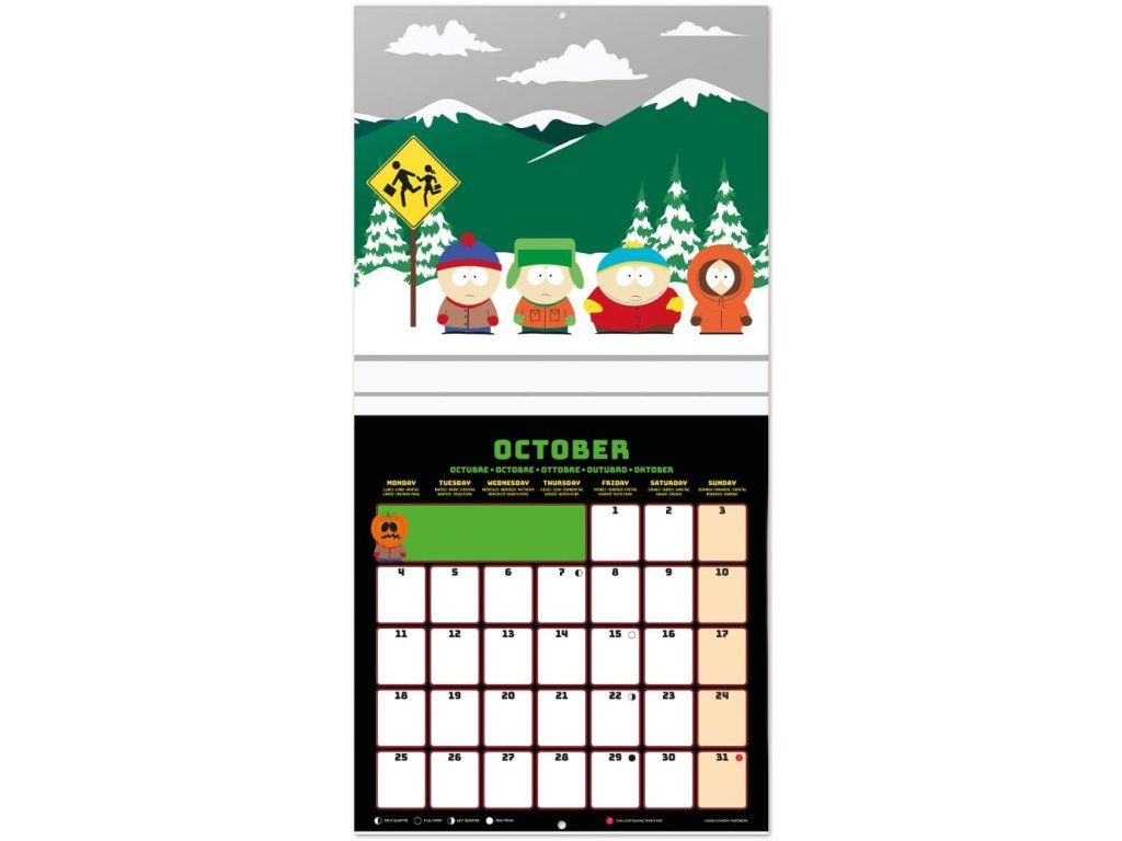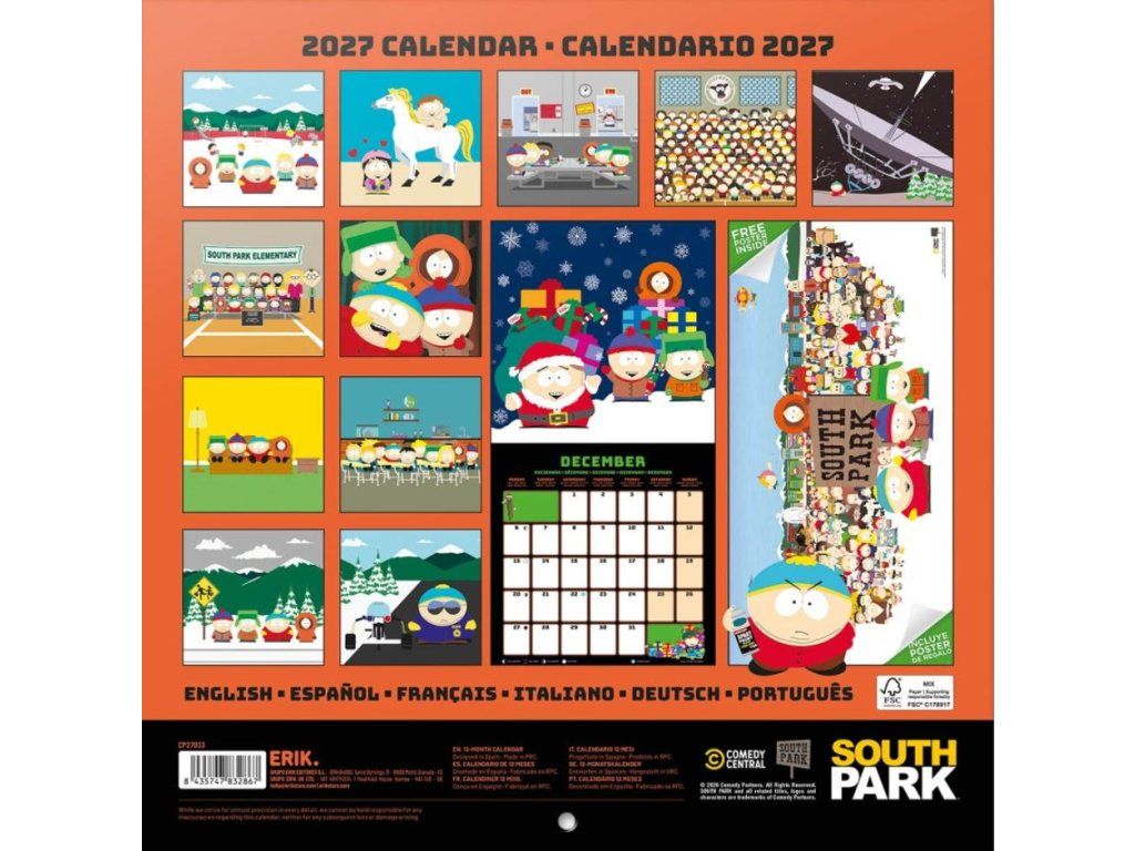 Oficiální nástěnný kalendář na 12 měsíců od ledna 2027 do konce roku 2027 s licencí populárního animovaného seriálu South Park.