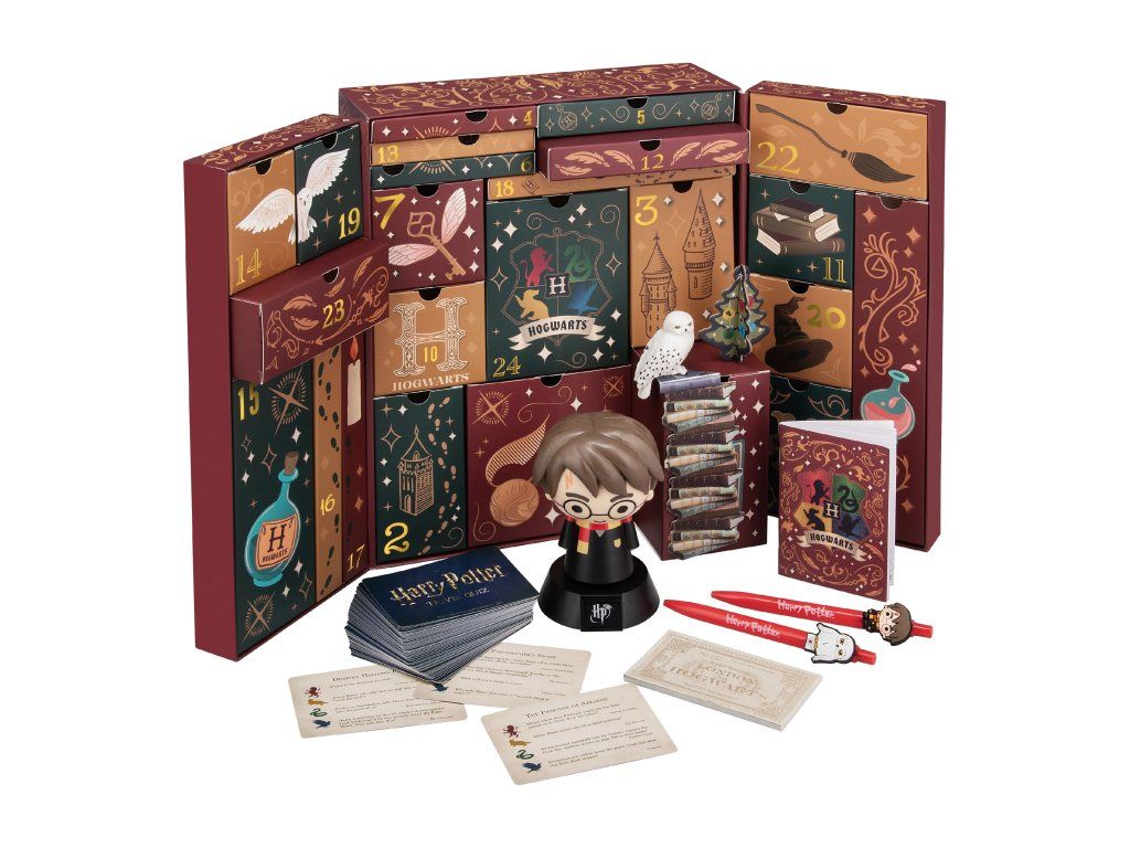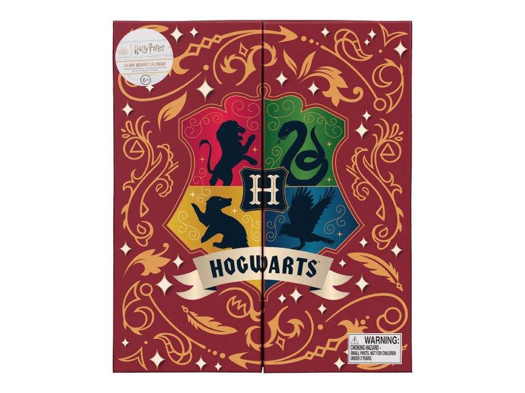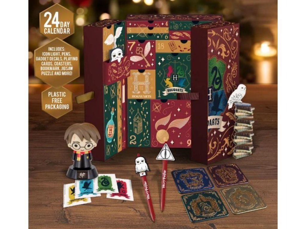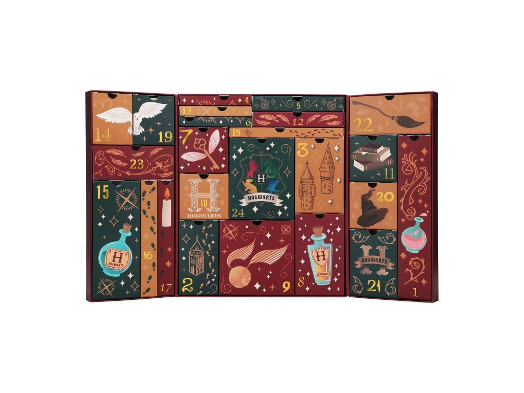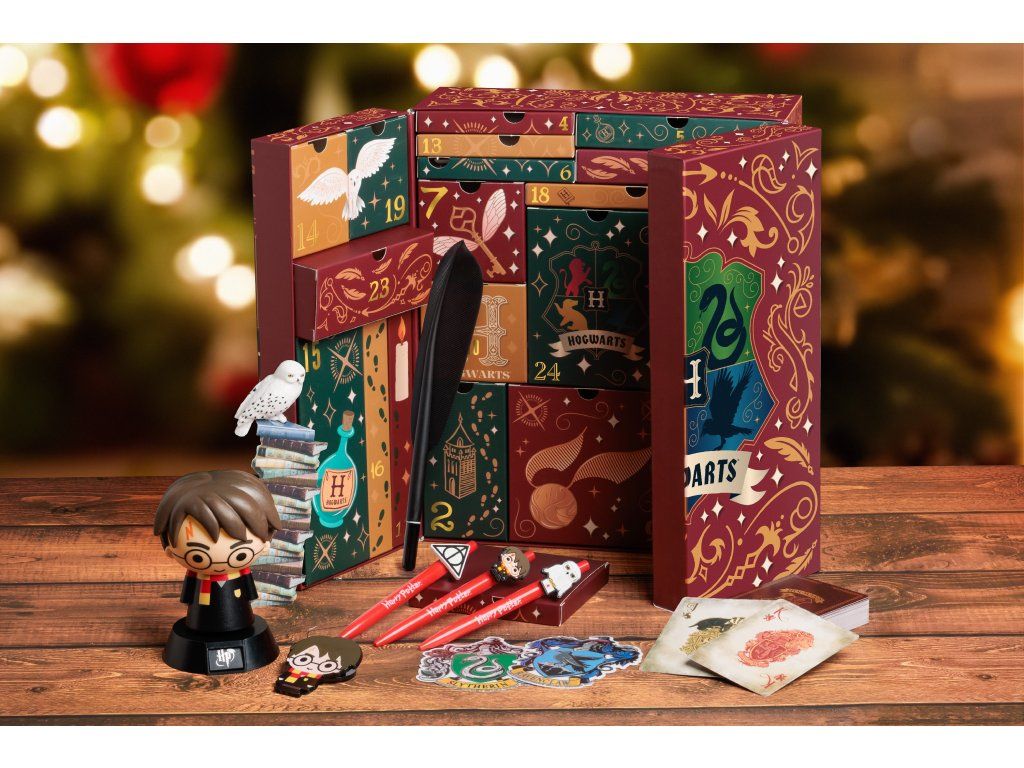 Adventní kalendář s 24 políčky k otevření a odpočítávání dnů do Vánoc. Kalendář je vyvedený do grafiky kouzelnického světa Harryho Pottera. Kalendář obsahuje 24 polí se dny v měsíci, které lze otevřít a najít zde jednu z 24 různých věcí v grafice z kouzelnického světa Harry Potter. Kalendář například obsahuje blok, propisky, figurku, podtácky a jiné předměty.