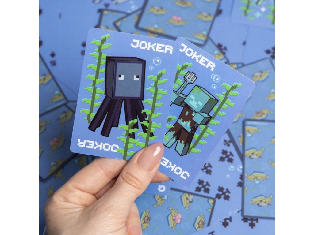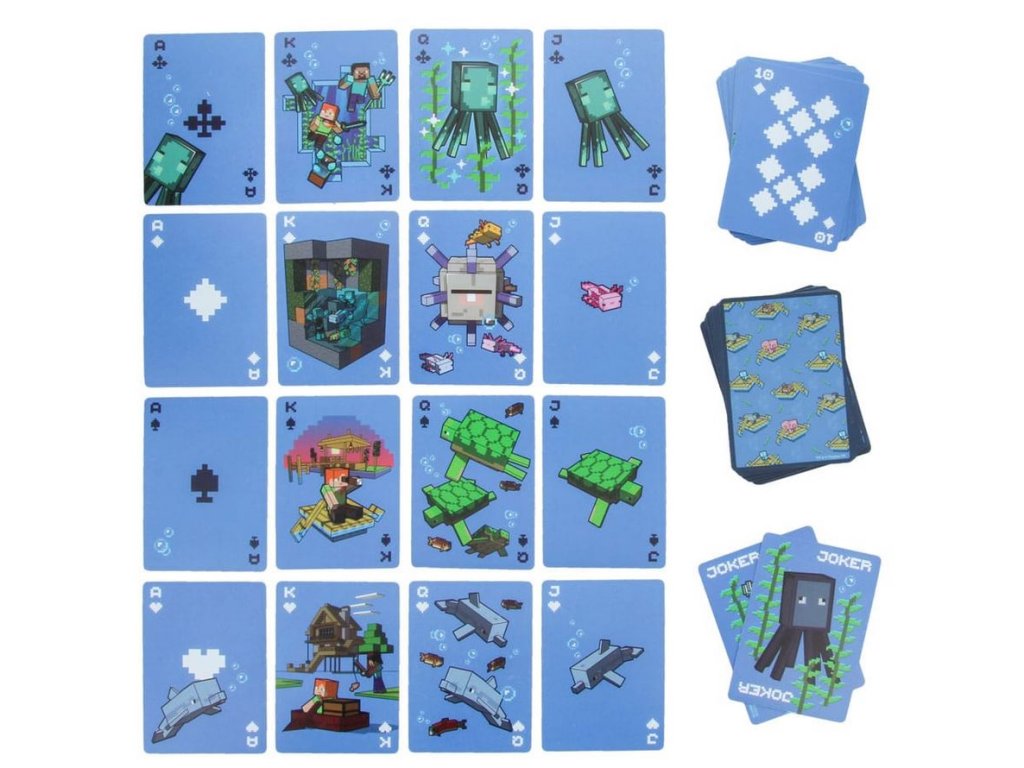 Provedení: Balíček obsahuje živé ilustrace postaviček ze světa Minecraftu. Na modrých kartách jsou živé motivy vodních tvorů z Minecraftu, které představují podvodní moby, jako jsou Elder Guardians, Axolotls, Glow Squids, Dolphins, Turtles a další. Každá karta je voděodolná a snadno se otírá, což zajišťuje dlouhotrvající zábavu.