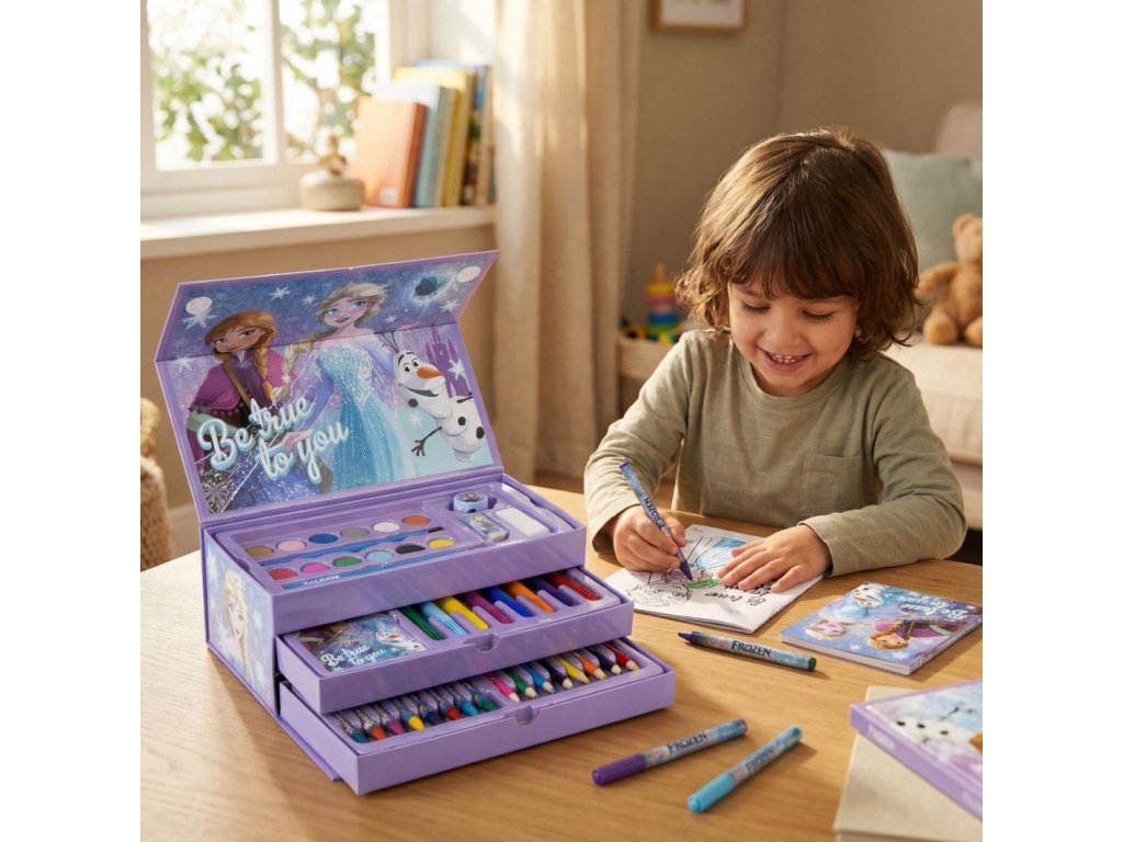 Kreativní kufřík s grafikou ledové královny Elsy a princezny Anny. Tento kufřík s výtvarnými potřebami je vhodný pro každého malého kreativního fanouška světa Ledové Království.