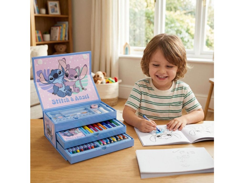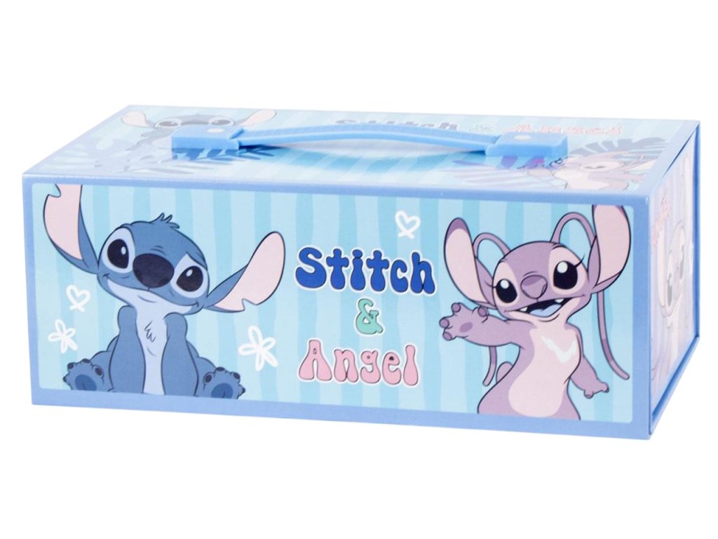 Kreativní kufřík s grafikou postavy Stitche s přáteli. Tento kufřík s výtvarnými potřebami je vhodný pro každého malého kreativního fanouška světa Lilo & Stitch.