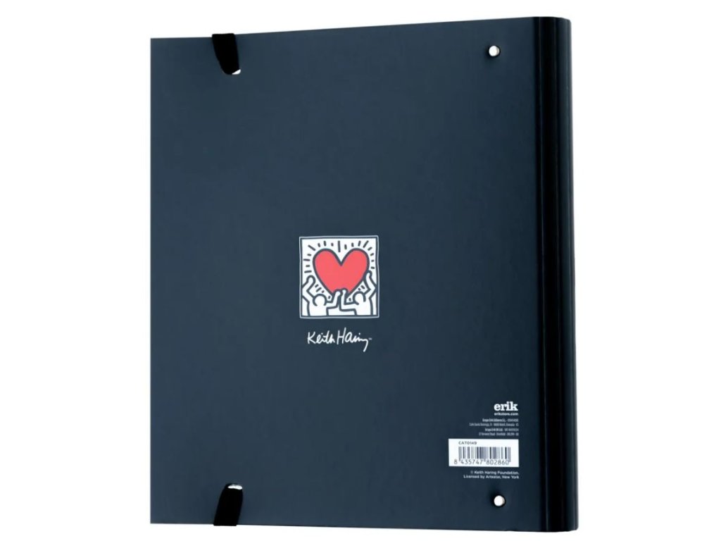 Kroužkový pořadač se spojovací svorkou se 4 kroužky v designu uměleckého díla Keitha Haringa. Pořadač ve formátu A4 se 4 kroužky na eurosložky či dokumenty a gumou proti nechtěnnému otevření pořadače. Vyrobeno z tvrdého kartonu o tloušťce 2 mm a podloženo 150 g matným laminovaným papírem.