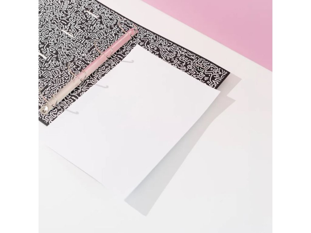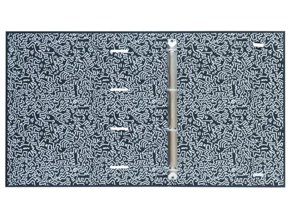 Oficiální produkt - kroužkový pořadač z katalogu kancelářského zboží s grafikou, fotografiemi a licencí umělce Keitha Haringa.