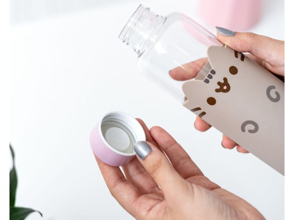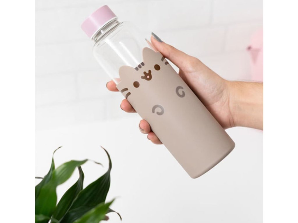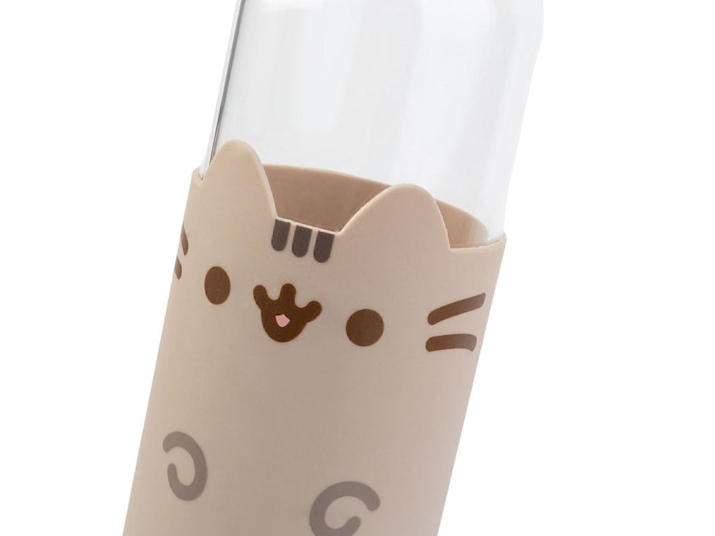 Oficiální produkt - skleněná láhev na pití z katalogu výrobků s grafikou a licencí populární kreslené kočky Pusheen.
