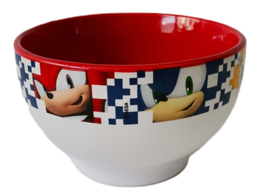 Bílá miska s červeným vnitřkem a s vícebarevným páskem s grafikou postav z herní videohry Sonic the Hedgehog. Miska vhodná jak na brambůrky, tak na snídaňové misky pro všechny fanoušky této videoherní série.