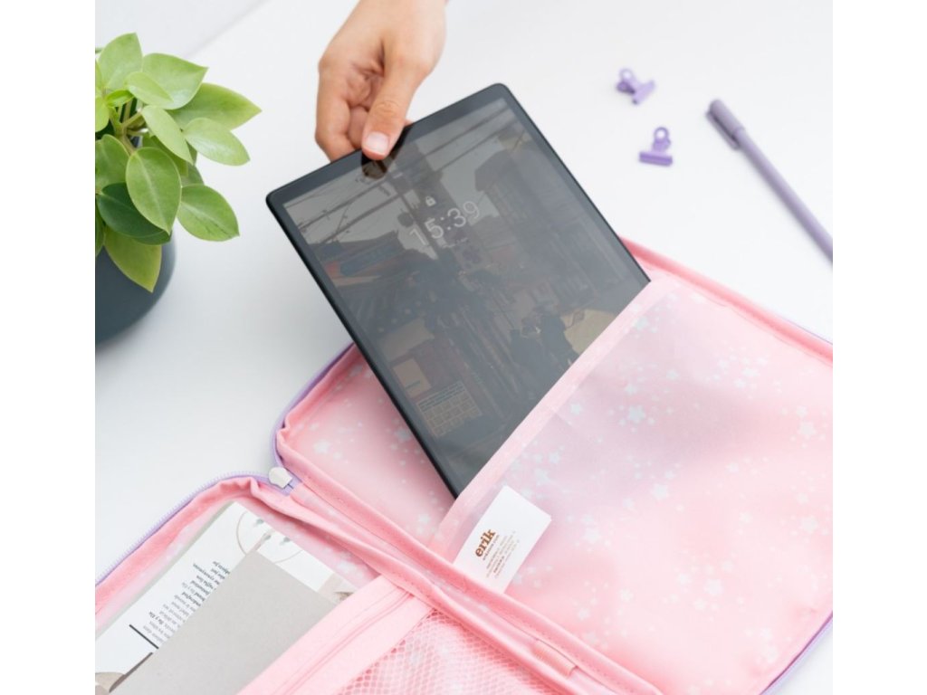 Obal na tablet fialové barvy inspirovaný kočkou Pusheen a nápisem I'm busy. Uvnitř obalu je na jedné straně kapsa na tablet nebo laptop do velikosti 12,8. Na straně druhé je kapsa na dokumenty a praktická síťovaná kapsa na zip například na nabíječku. Roztomilý obal na tablet je vhodný pro všechny fanoušky této kočičky.