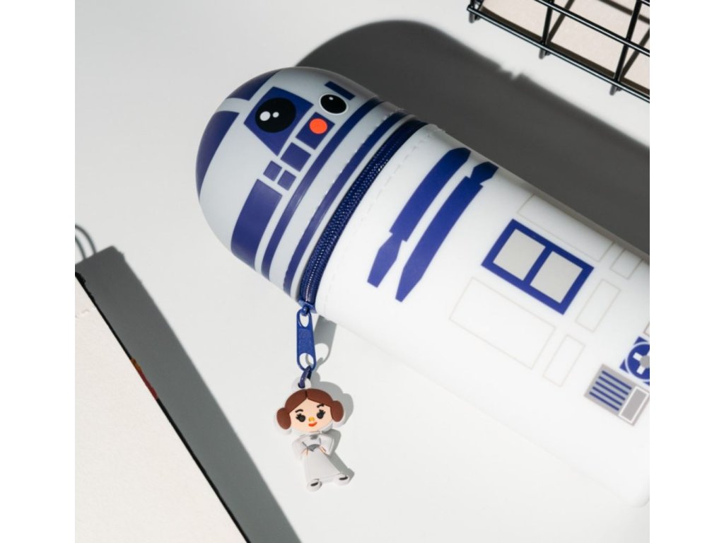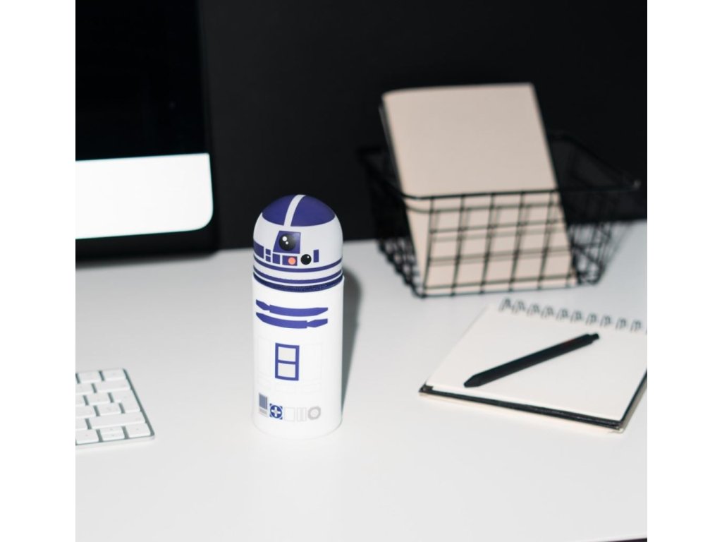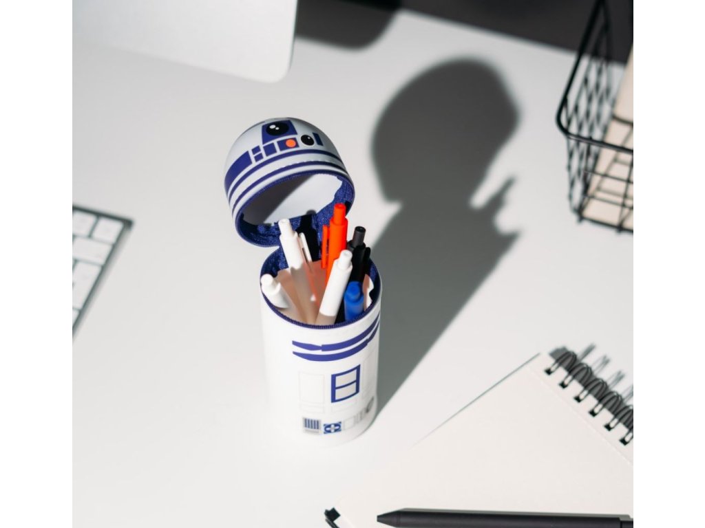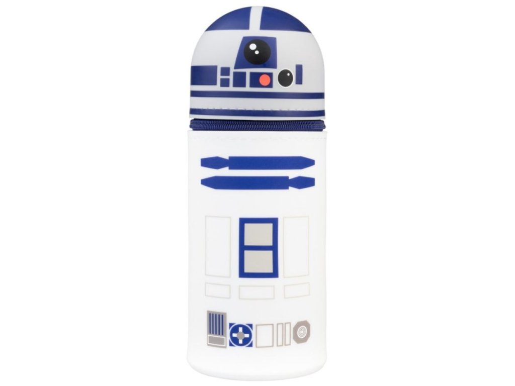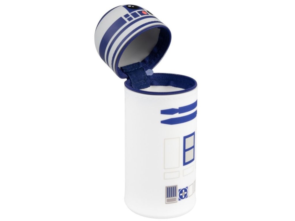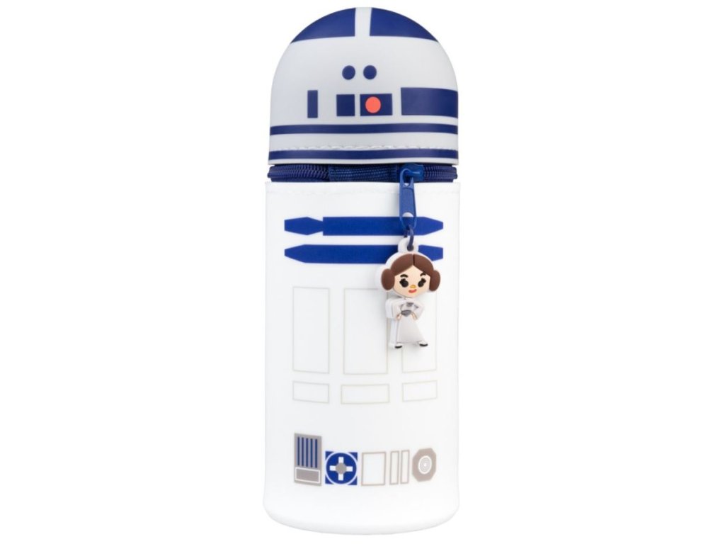 Atraktivní jednodilný 3D penál v provedení barelu s motivem postavy R2-D2. Má zapínání na zip v oblasti pod hlavou postavy a je vyroben ze silikonu. Měří 6,5 x 17 cm, i když velikost lze zvětšit, protože je ve spodní části rozšiřitelný. Penál je možno použit také jako stojan na tužky.