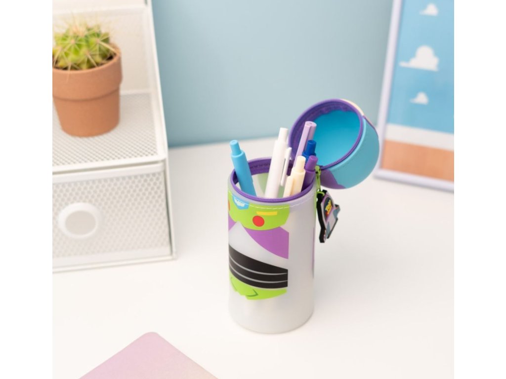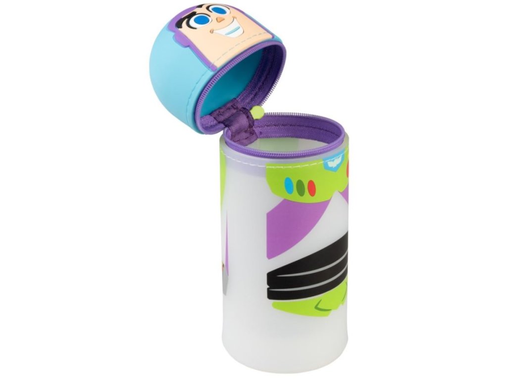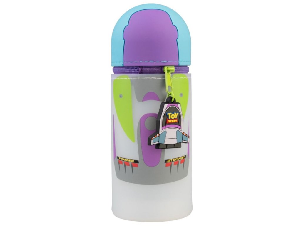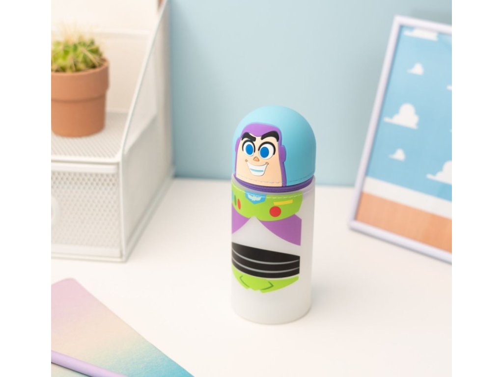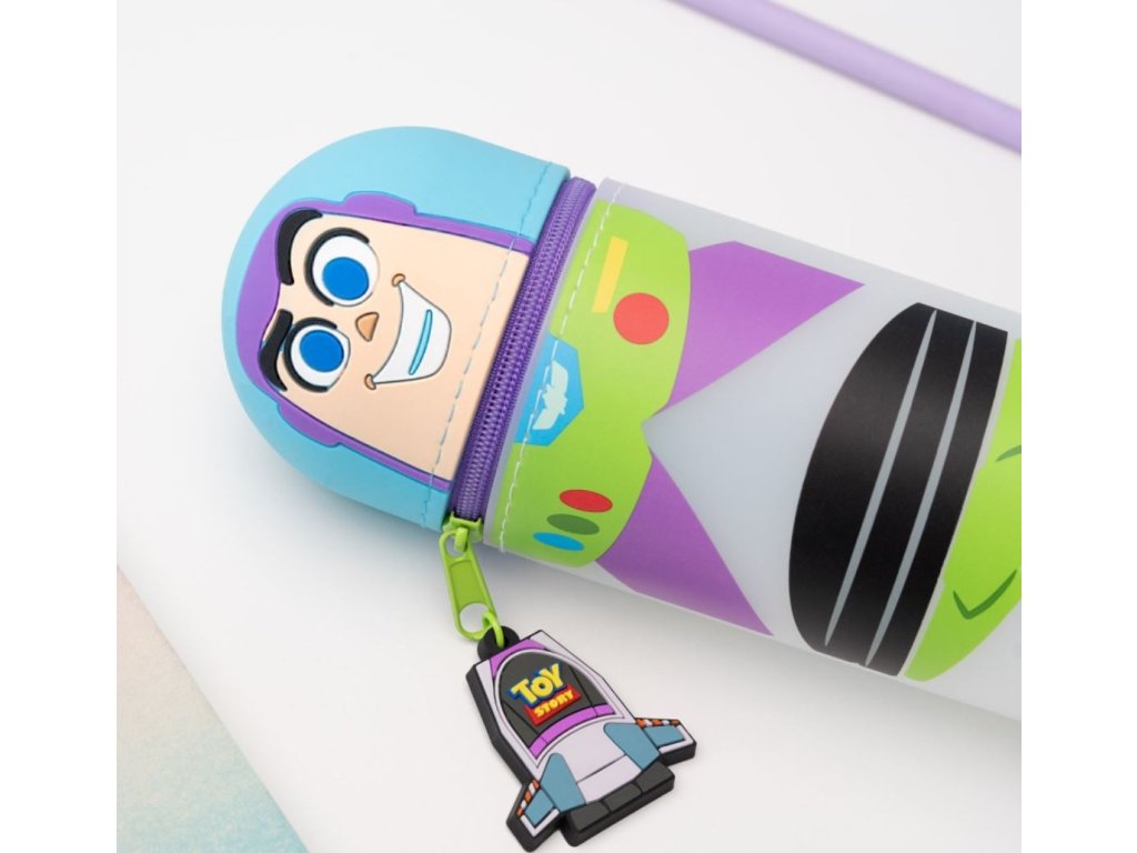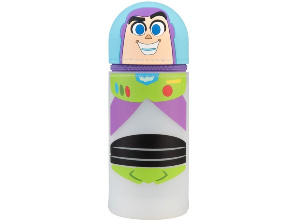 Atraktivní jednodilný 3D penál v provedení barelu s motivem postavy hračky Rakeťáka Buzze. Má zapínání na zip v oblasti pod hlavou postavy a je vyroben ze silikonu. Měří 6,5 x 17 cm, i když velikost lze zvětšit, protože je ve spodní části rozšiřitelný. Penál je možno použit také jako stojan na tužky.