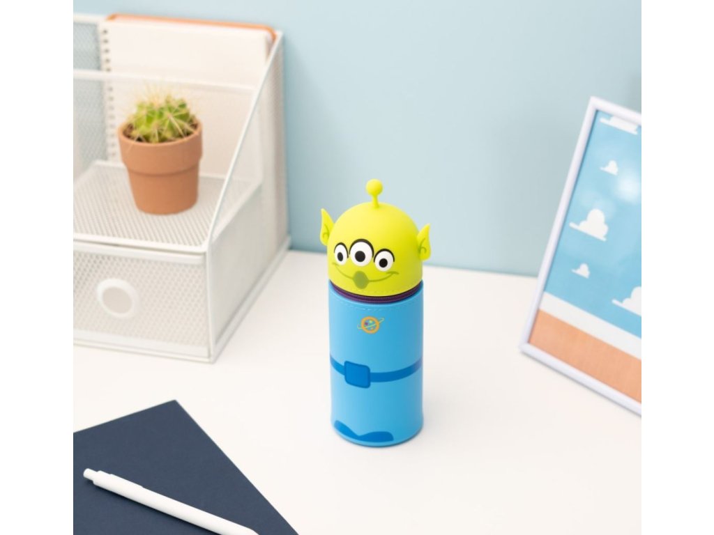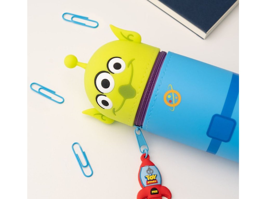 Atraktivní jednodilný 3D penál v provedení barelu s motivem postavy hračky mimozemšťana. Má zapínání na zip v oblasti pod hlavou postavy a je vyroben ze silikonu. Měří 6,5 x 17 cm, i když velikost lze zvětšit, protože je ve spodní části rozšiřitelný. Penál je možno použit také jako stojan na tužky.