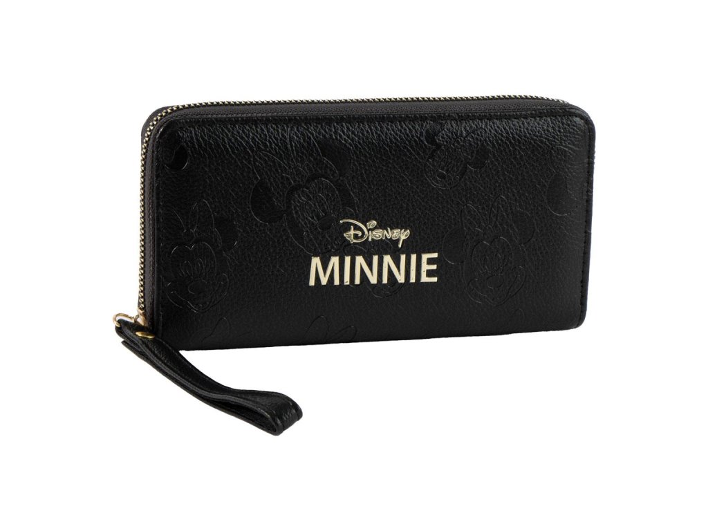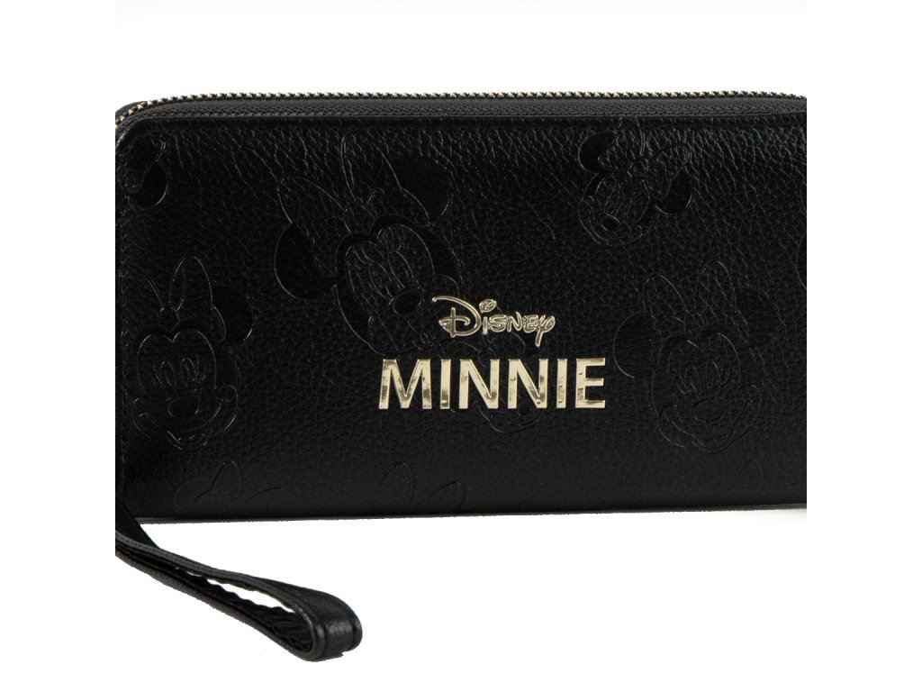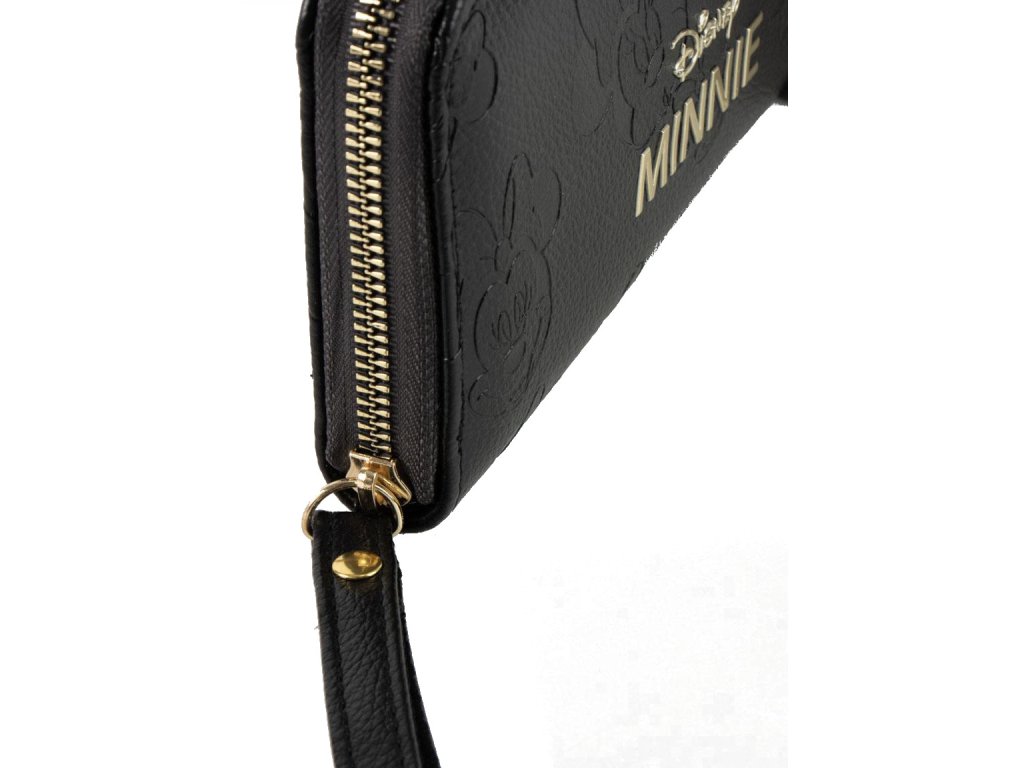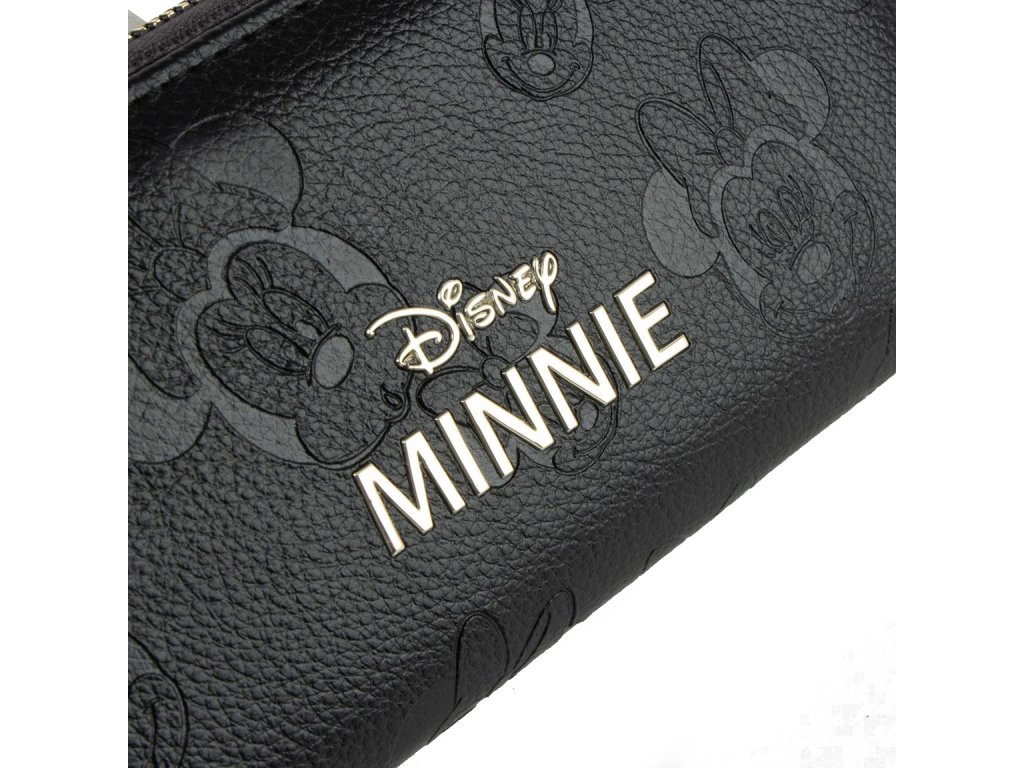 Černá peněženka vyvedená s grafickými ikonami Minnie Mouse z pohádky Mickey Mouse od společnosti Disney. Peněženka má spoustu místa na všechny vaše karty, hotovost i drobné a je na zapínání na zip.