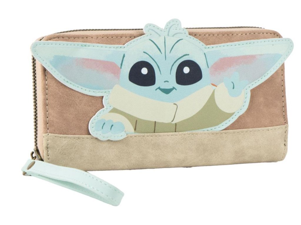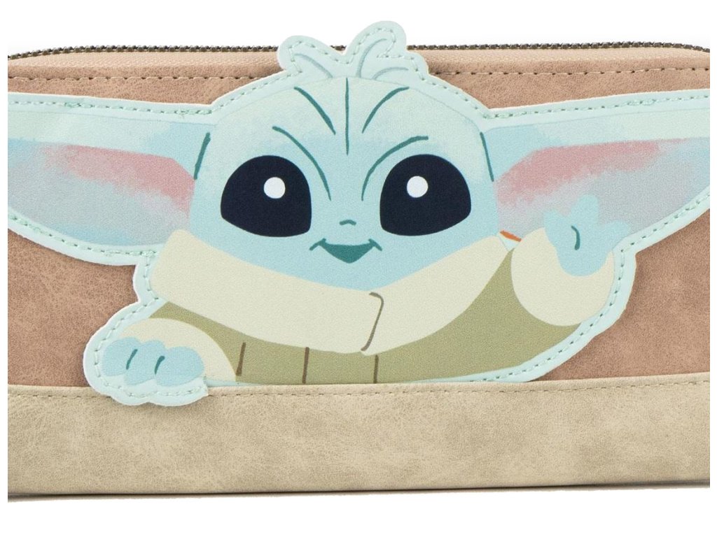 Hnědá peněženka vyvedená s grafikou Baby Yody s vyčuhujícíma ušima. Peněženka má spoustu místa na všechny vaše karty, hotovost i drobné a je na zapínání na zip s poutkem na uchycení na ruku.