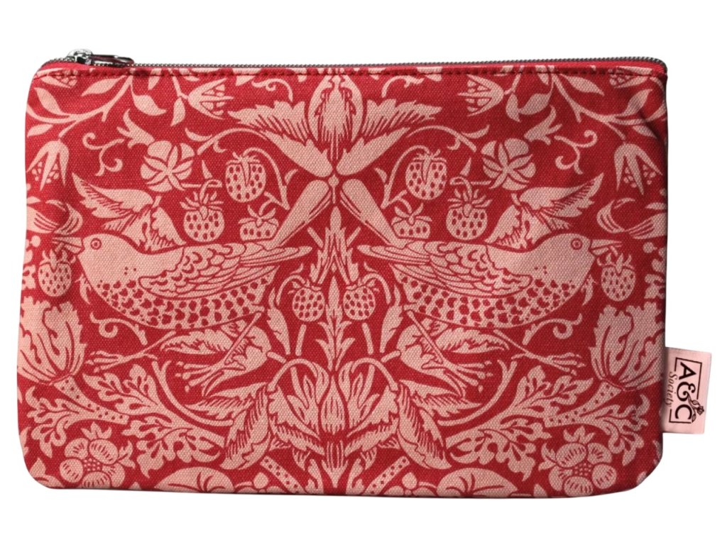 Elegantní bavlněná peněženka na mince zdobená bohatým přírodním motivem inspirovaným tvorbou Williama Morrise. Červený podklad doplňuje světlý, ale výrazný dekor s ptáky, květinami a rostlinnými ornamenty, který peněžence dodává jedinečný umělecký vzhled. Peněženka má zapínání na zip a je vyrobena z kvalitní bavlny, která je odolná, lehká a ideální pro každodenní použití - do práce, do školy i na výlety.