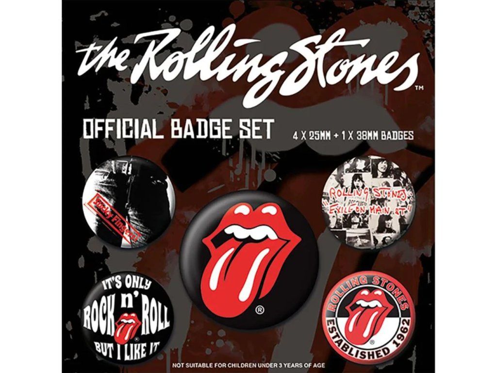 Oficiální placky z katalogu produktů s logem, fotografiemi a grafikou slavné britské rockové skupiny Rolling Stones.