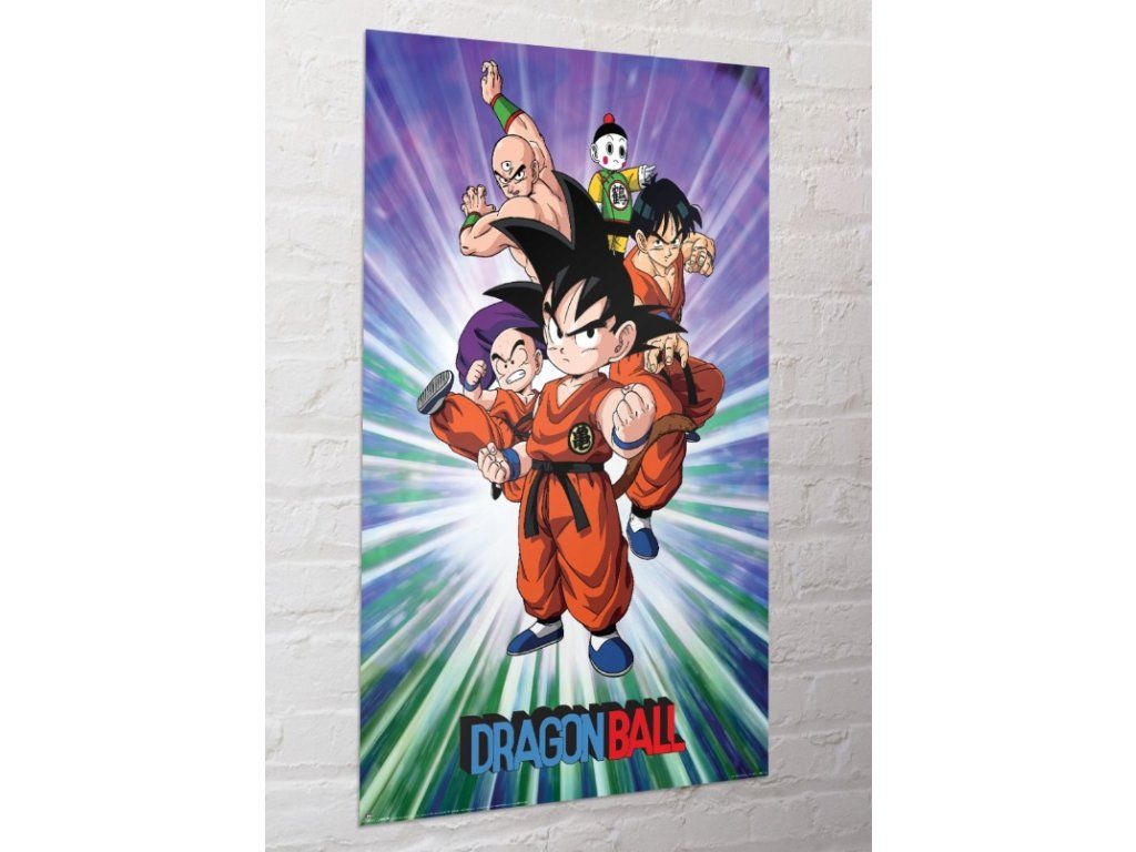 Tento plakát zachycuje mladého Goka a jeho věrné spolubojovníky v dynamické bojové formaci. Son Goku v čele sestavy s odhodlaným výrazem a sevřenými pěstmi, připraven čelit jakékoliv výzvě. V pozadí nechybí klíčoví hrdinové raných let - tříoký mistr Tien Shinhan, mrštný Krillin, silný Yamcha a tajemný Chiaotzu. Spodní část zdobí klasické logo Dragon Ball, které potvrzuje autenticitu a sběratelskou hodnotu motivu. Ideální pro fanoušky, kteří chtějí mít doma kousek historie světa Akiry Toriyamy.