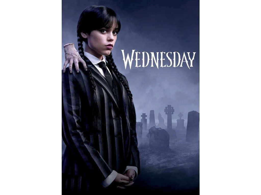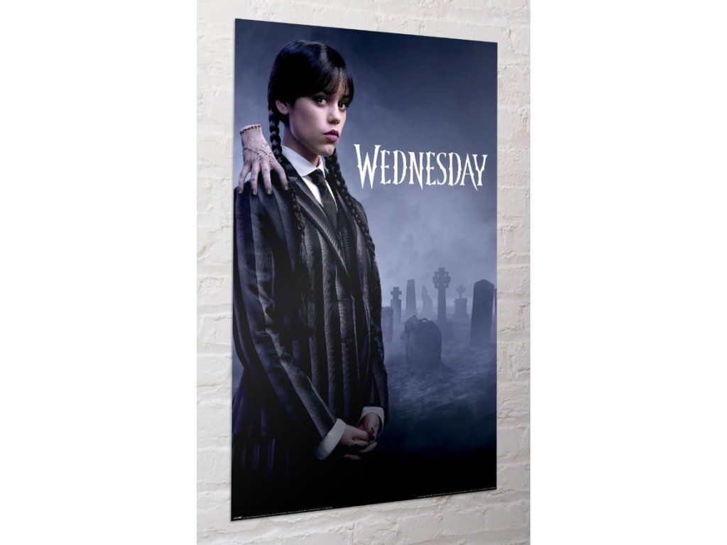 Vneste do svého pokoje atmosféru akademie Nevermore! Tento ikonický plakát zachycuje Wednesday Addamsovou v jejím typickém černobílém pruhovaném saku. Doprovází ji věrný společník na rameni, to vše na pozadí mlžného hřbitova, který dokonale podtrhuje gotickou estetiku seriálu. Plakát je originální dekorace interiéru a je pro všechny milovníky seriálu Wednesday.