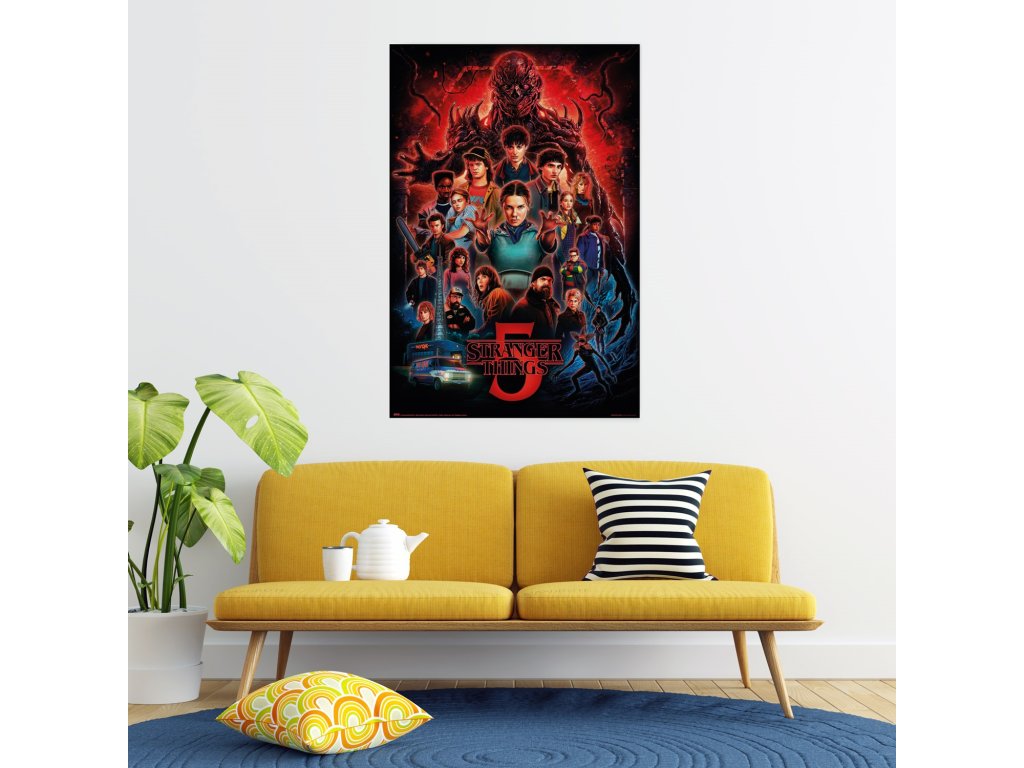 Umělecký plakát s grafikou všech postav z páté série seriálu Stranger Things. Plakát lze pověsit samostatně, nebo pro atraktivnější vzhled zarámovat do rámu a vytvořit si tak neobyčejně velký obraz. Jste velkým fanouškem Stranger Things? V tom případě vám tento plakát poslední série nesmí ve vaší sbírce chybět! Plakát je vhodným doplňkem do každého pokoje každého správného fanouška této odvážné party a světa Upside down.