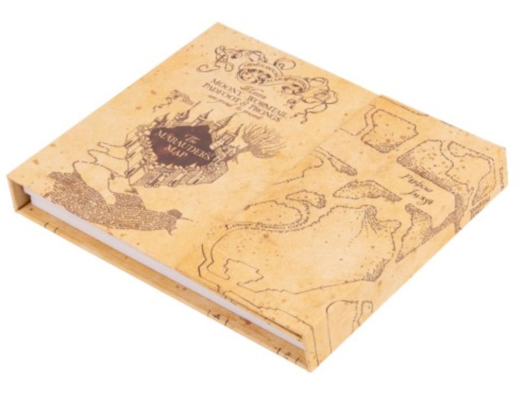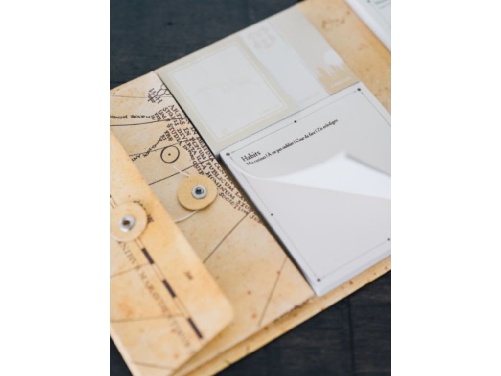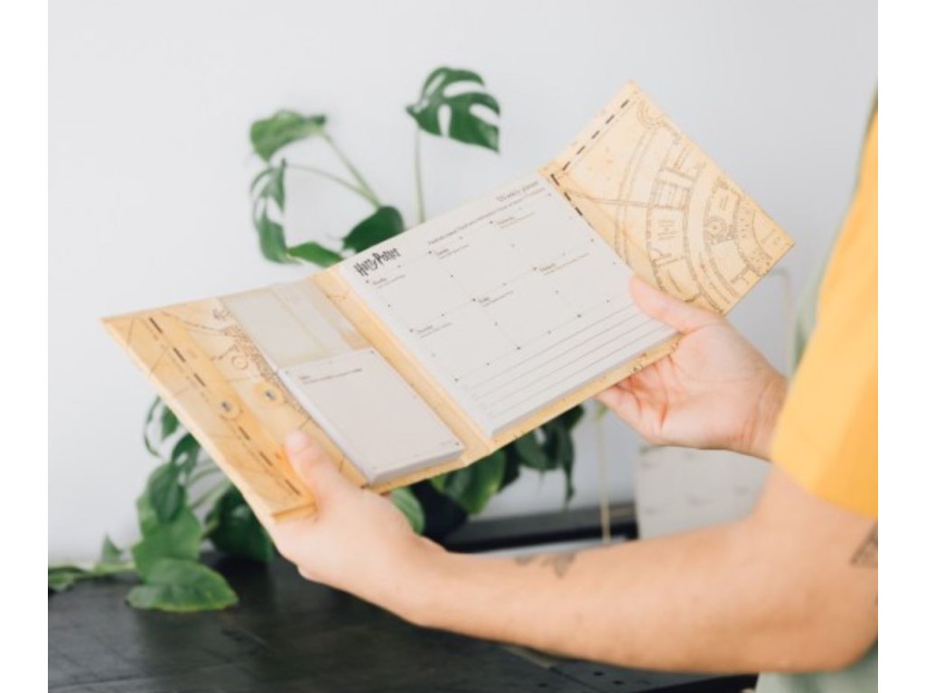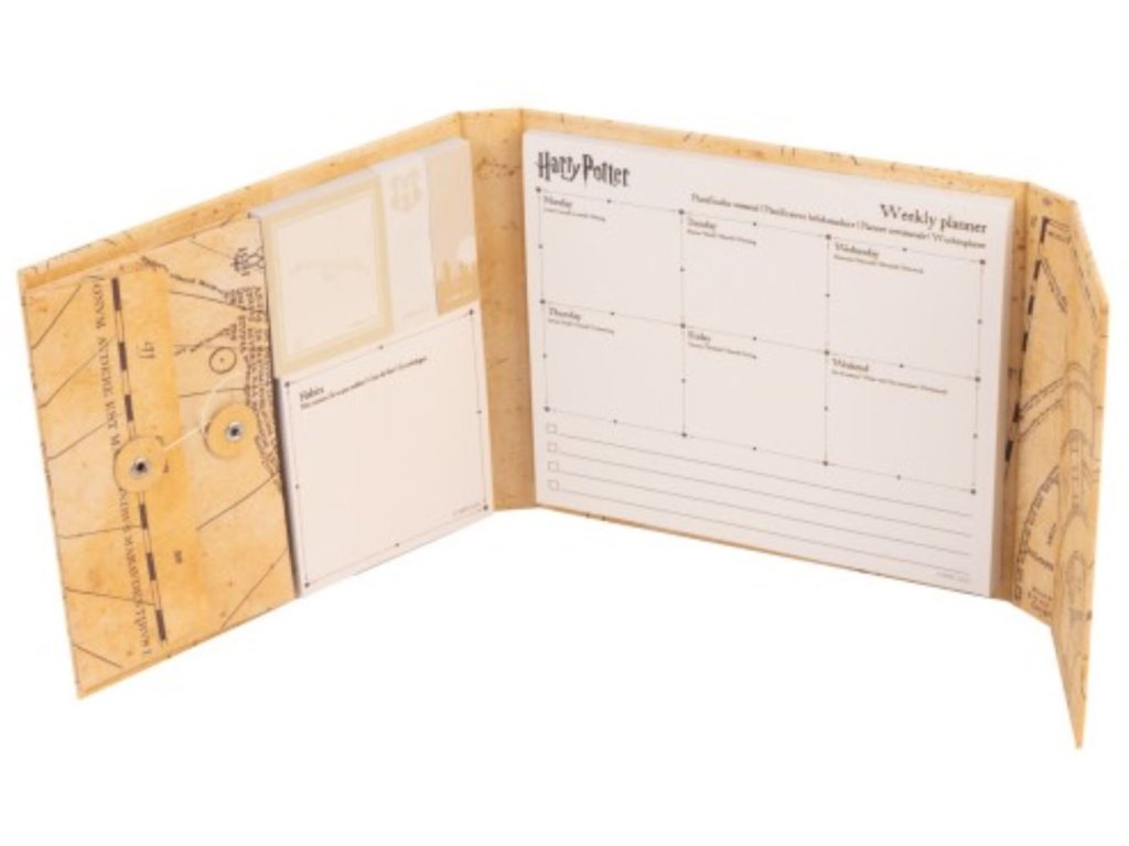 Týdenní plánovací podložka vyvedený jako Pobertův plánek z Harryho Pottera. Ideální pro plánování úkolů na celý týden. Jednoduše zapíšete vše, co na daný týden máte v plánu, a po uplynutí daného týdne stránku odtrhnete a můžete plánovat dále. Obsahuje týdenní plánovací blok 181 x 152 mm, 1 poznámkový blok 91 x 91 mm, 1 samolepicí blok 52 x 62 mm a 2 samolepicí bloky 20 x 62 mm. Součástí je vykrajovaná obálka o rozměrech 89 x 152 mm uzavíratelná provázkem. Rozměry 190 x 167 x 23 mm ve složeném stavu a 500 mm v otevřeném stavu. Obálka je vyrobena z 2 mm silného kartonu s magnetickým uzávěrem.