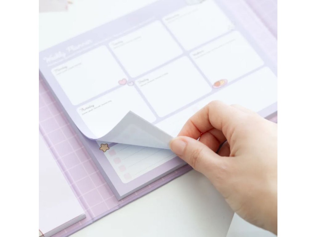 Plánovač inspirovaný roztomilou kočičkou Pusheen. Obsahuje týdenní plánovač na vaše osobní i rodinné plánování aktuálního týdne, poznámkový blok pro důležité poznámky či nákupní seznam, blok s lepicími štítky třeba pro rodinné vzkazy, které můžete kdekoliv přilepit a dva bloky s menšími lepicími štítky například pro poznačení důležitých poznámek v bloku. Součástí je i obálka, například i na letenky či jízdenky. Pro snadné použití knihy je zapínání na magnet.