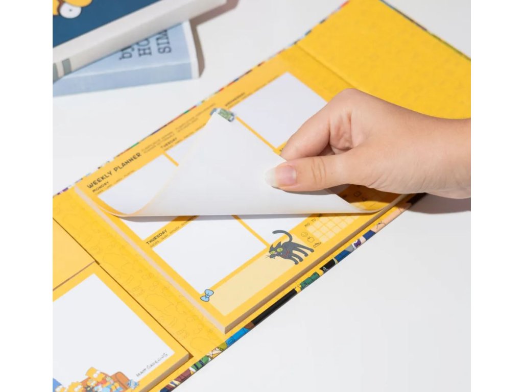Týdenní plánovací podložka. Ideální pro plánování úkolů na celý týden. Jednoduše zapíšete vše, co na daný týden máte v plánu, a po uplynutí daného týdne stránku odtrhnete a můžete plánovat dále. Obsahuje týdenní plánovací blok 181 x 152 mm, 1 poznámkový blok 91 x 91 mm, 1 samolepicí blok 52 x 62 mm a 2 samolepicí bloky 20 x 62 mm. Součástí je vykrajovaná obálka o rozměrech 89 x 152 mm uzavíratelná provázkem. Rozměry 190 x 167 x 23 mm ve složeném stavu a 500 mm v otevřeném stavu. Obálka je vyrobena z 2 mm silného kartonu s magnetickým uzávěrem.