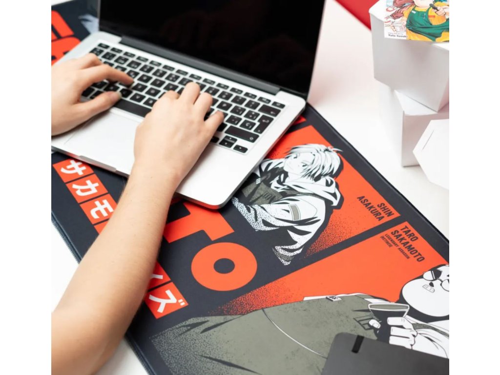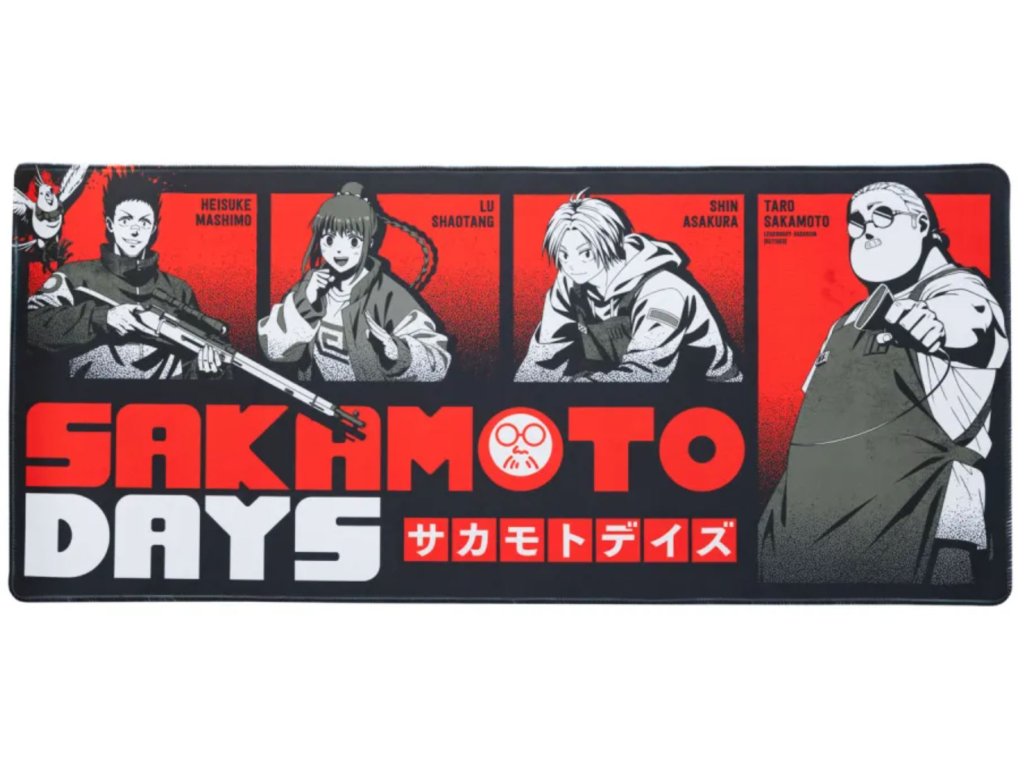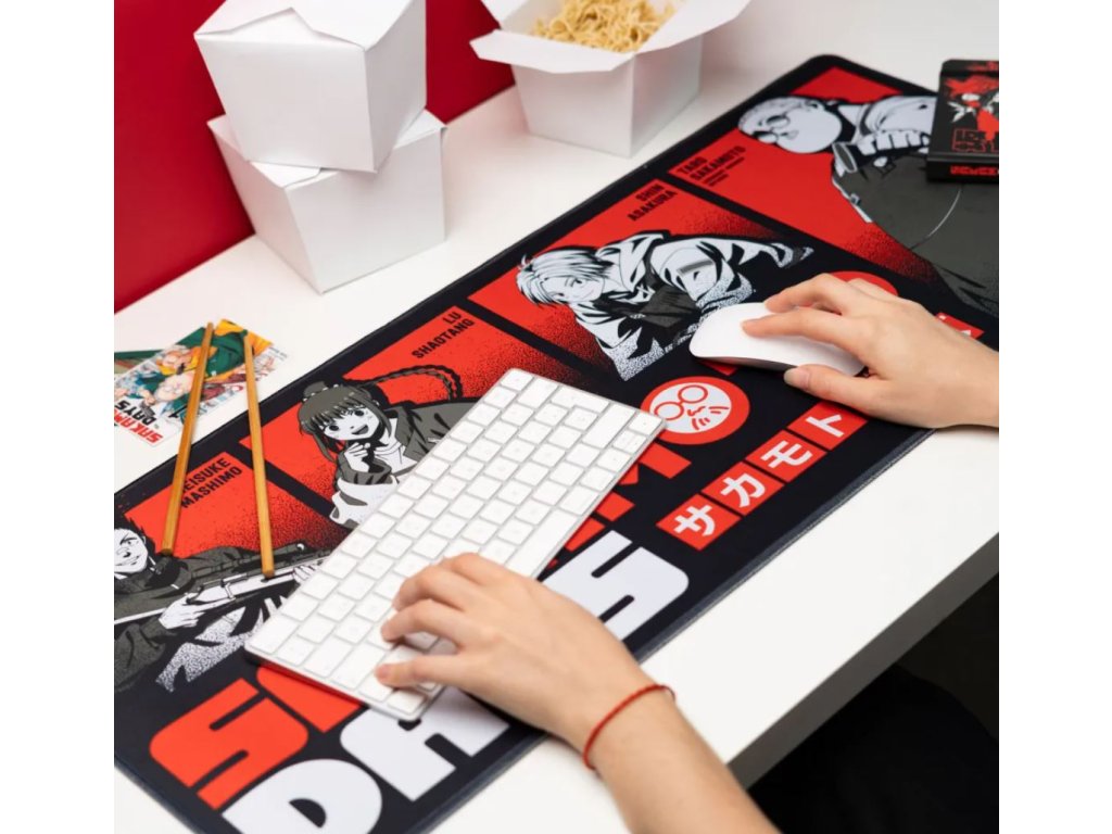 Oficiální produkt - herní podložka na stůl z katalogu kancelářského a počítačového zboží s logem, fotografiemi a grafikou populární japonské mangy Sakamoto Days.
