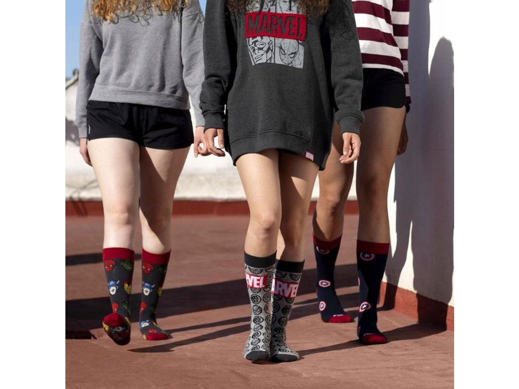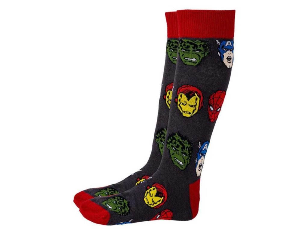 Pár atraktivních pánských ponožek s motivem ikon obličejů od členů superhrdinského týmu Avengers od společnosti Marvel.