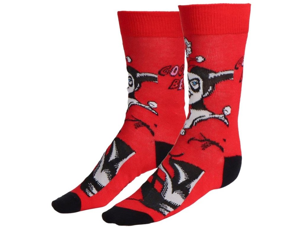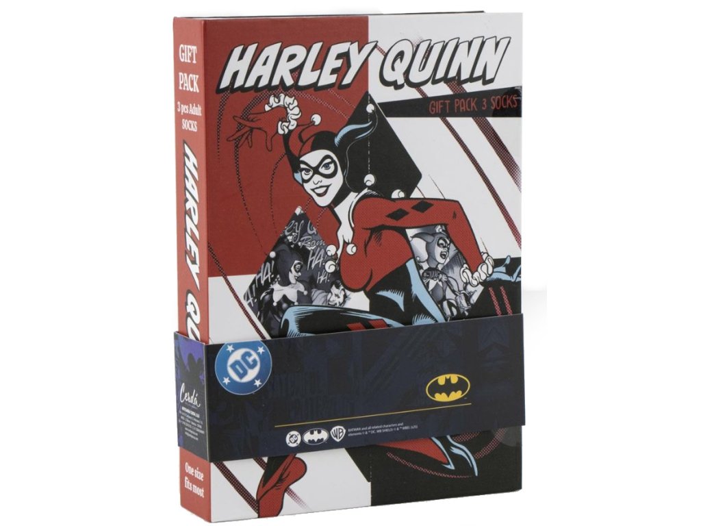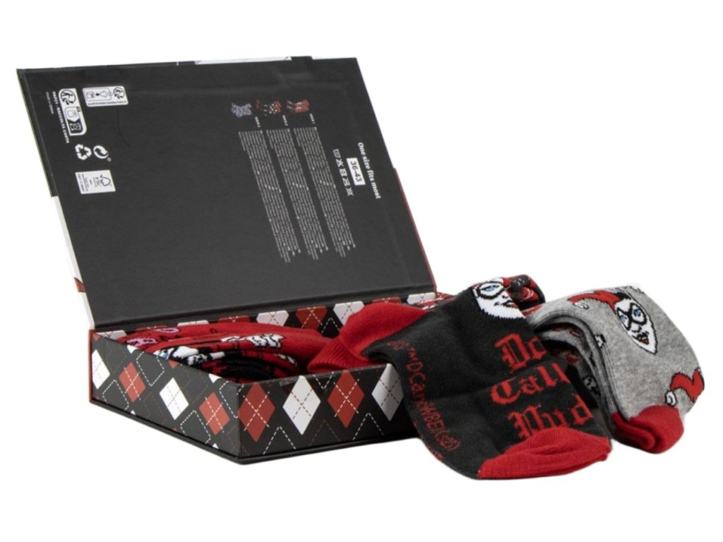 Oficiální produkt - dárkový set dámských ponožek a doplňkového zboží z katalogu produktů s grafikou, motivem a licencí populární postavy Harley Quinn od komiksové společnosti DC Comics.