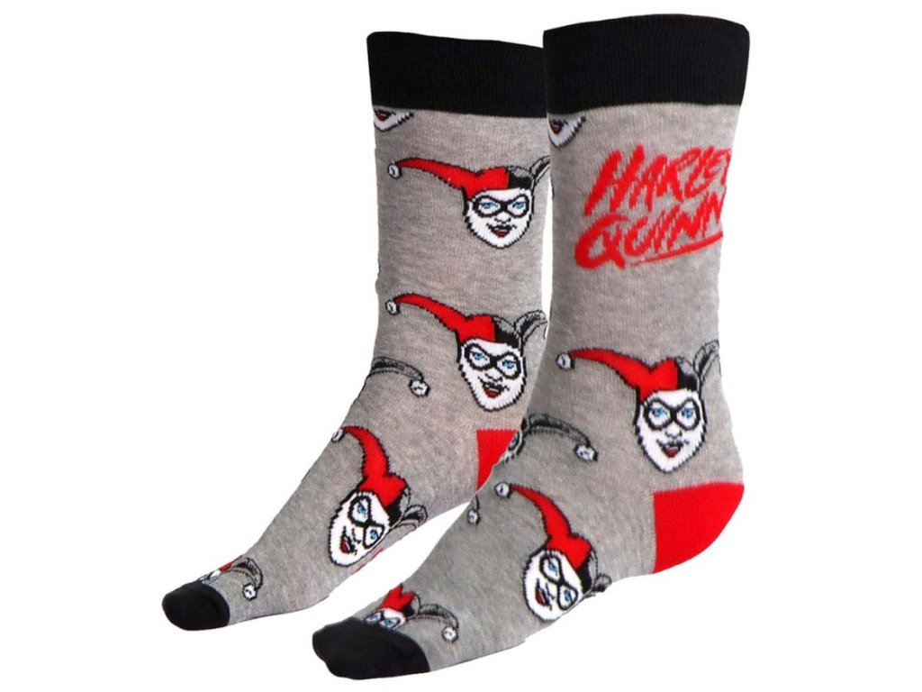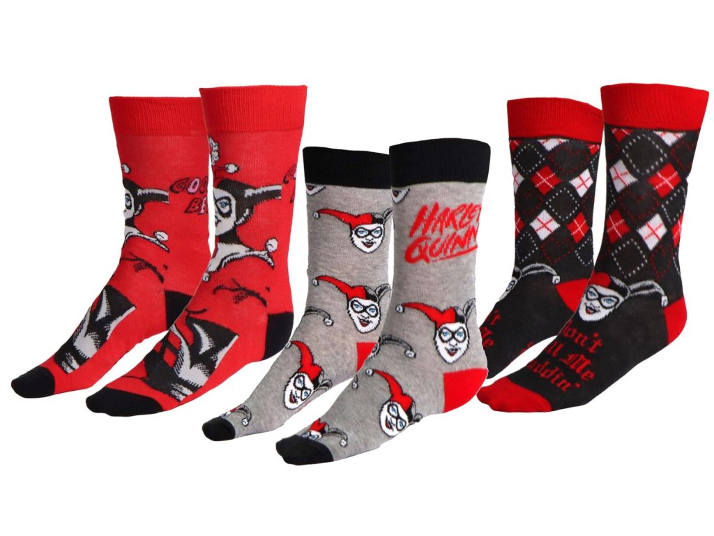 Dárkový set 3 párů atraktivních dámských červeno-šedých ponožek s motivem oblíbené postavy Harley Quinn. Ponožky jsou vhodným doplňkem každého velkého fanouška této postavy a rozhodně ozvláštní váš každodenní outfit.