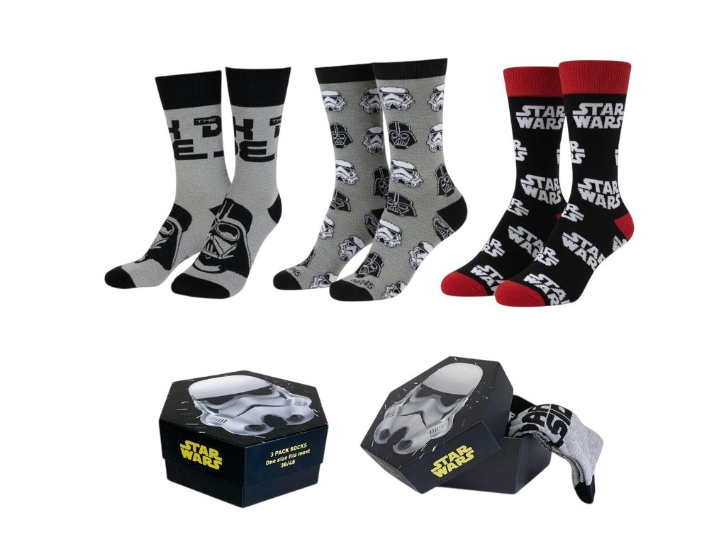 Dopřejte si naši dárkovou sadu ponožek Star Wars. Tato sada obsahuje tři páry ponožek s postavami Darthvader, Stormtrooper a nápisem Star Wars. Ponožky jsou elegantně zabalené v designové dárkové krabičce, takže jsou perfektním dárkem pro vás nebo promyšleným dárkem pro každého nadšence série Star Wars.Ponožky jsou skvělým dárkem pro každého menšího i většího fanouška.