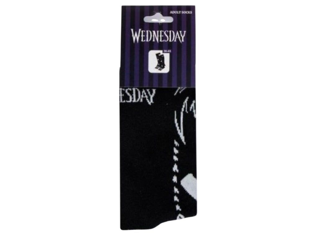 Oficiální ponožky a doplňkové zboží z katalogu produktů se znakem a grafikou ze slavného mysteriózního seriálu Wednesday.