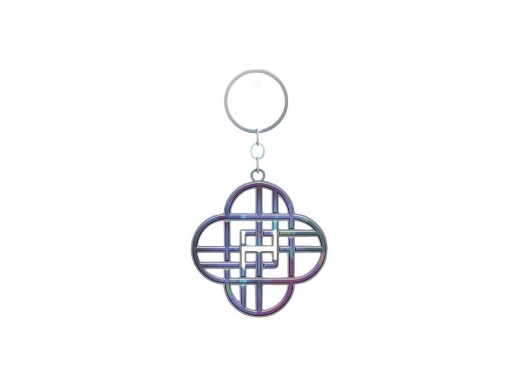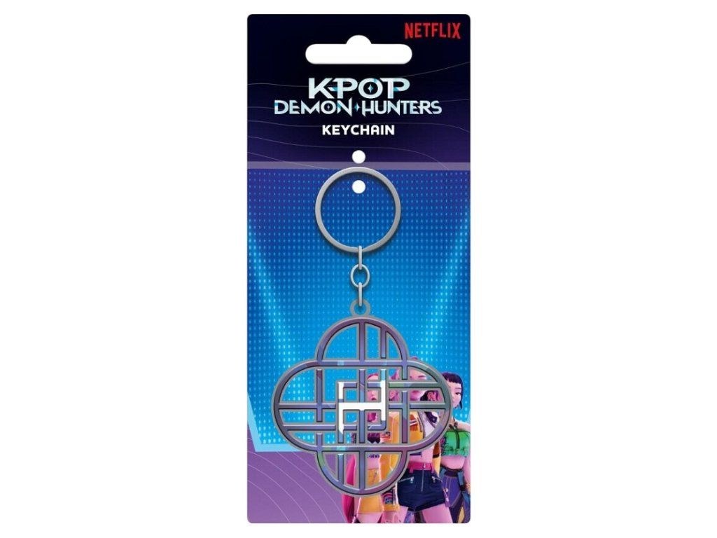 Oficiální produkt - přívěsek na klíče z katalogu výrobků s logem, fotografiemi a grafikou amerického fantasy filmu K-Pop Demon hunters (Lovkyně démonů) od streamovací společnosti Netflix.