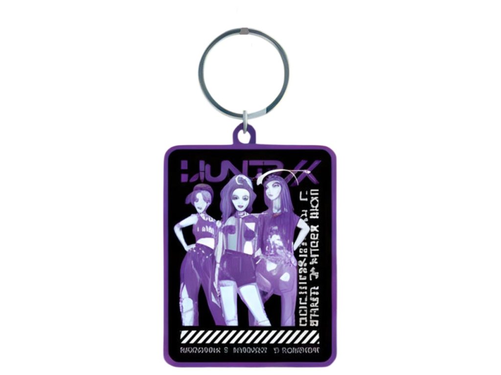 Oficiální produkt - přívěsek na klíče z katalogu výrobků s logem, fotografiemi a grafikou amerického fantasy filmu K-Pop Demon hunters (Lovkyně démonů) od streamovací společnosti Netflix.