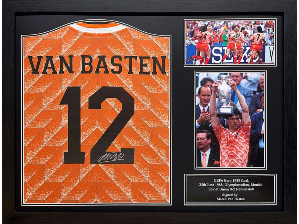 Skutečná replika dresu Nizozemska z mistrovství světa 1988. Ručně podepsaný fotbalistou Marcem Van Bastenem na čísle dresu. S vyobrazením a textem UEFA Euro 1988 FInal, 25. června 1988, Olympiastadion, Mnichov, Sovětský svaz 0-2 Nizozemsko.