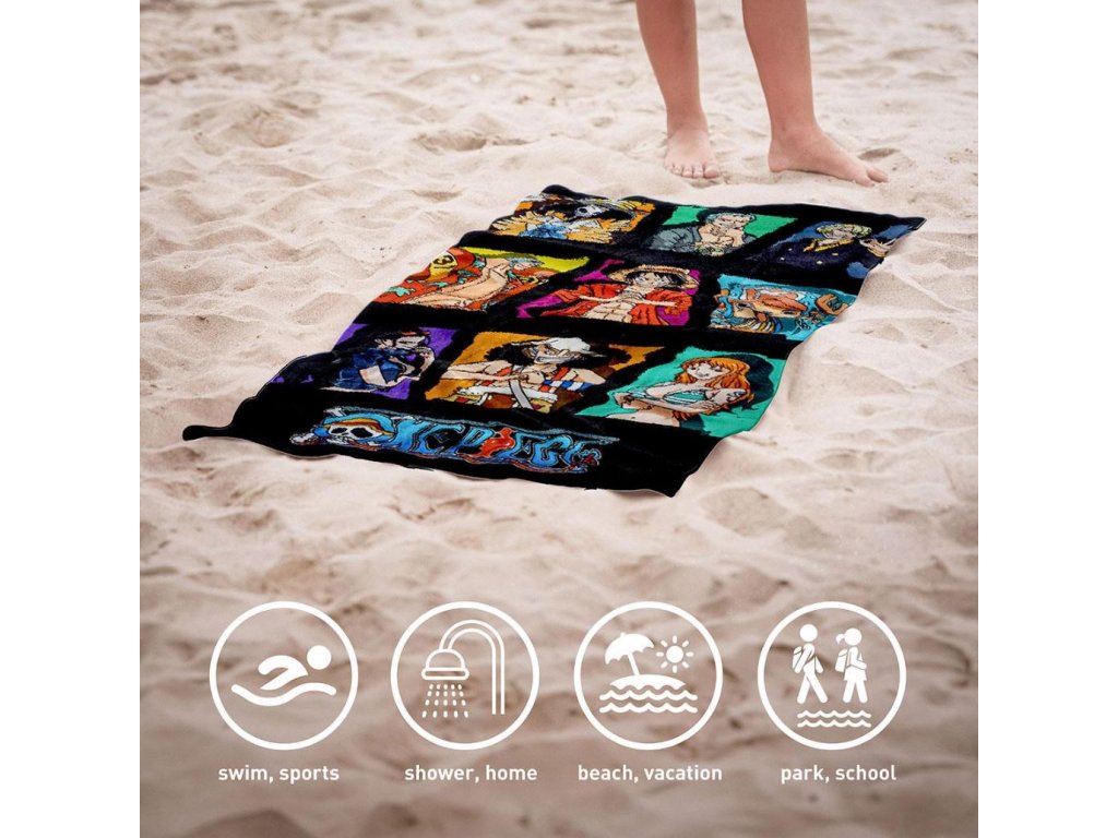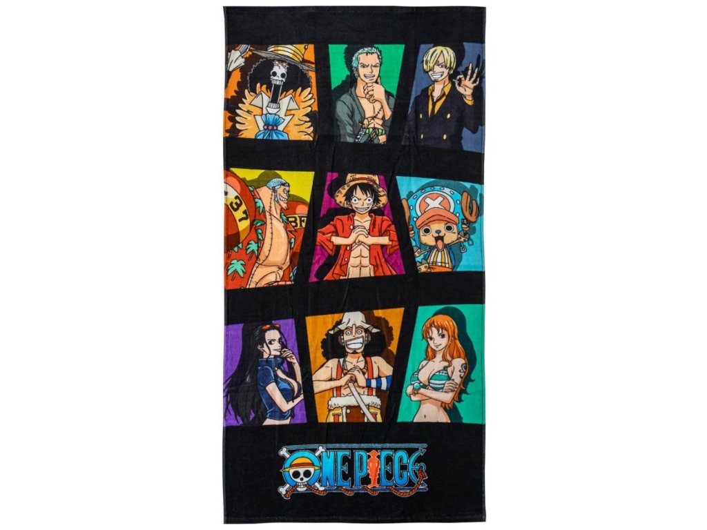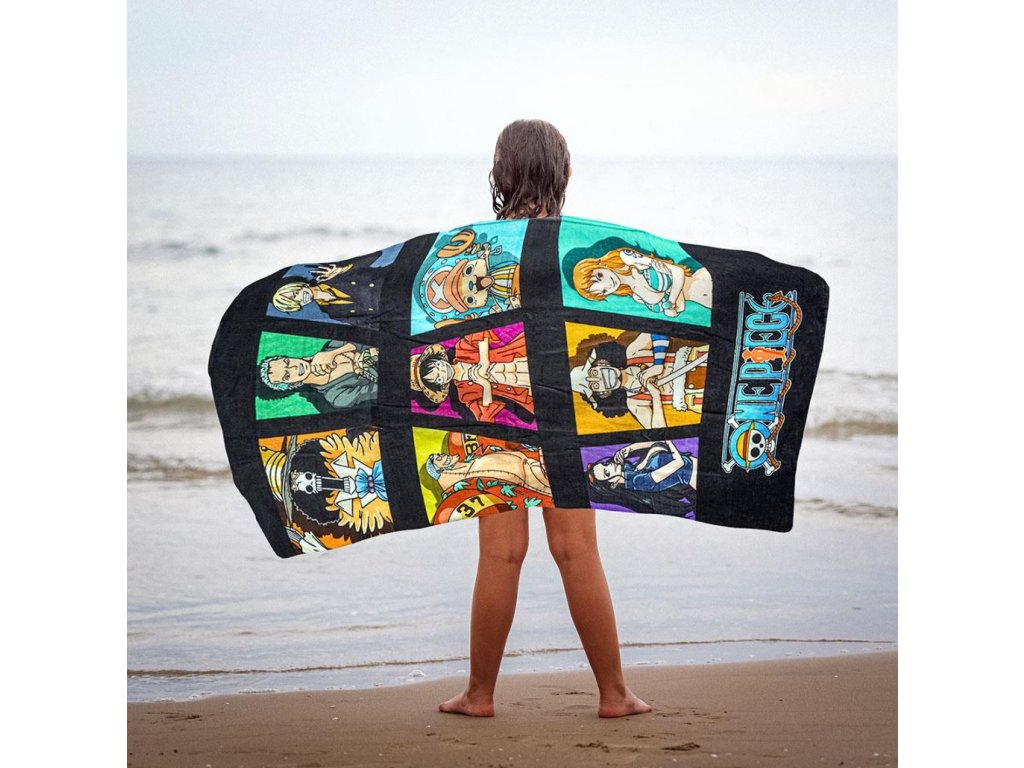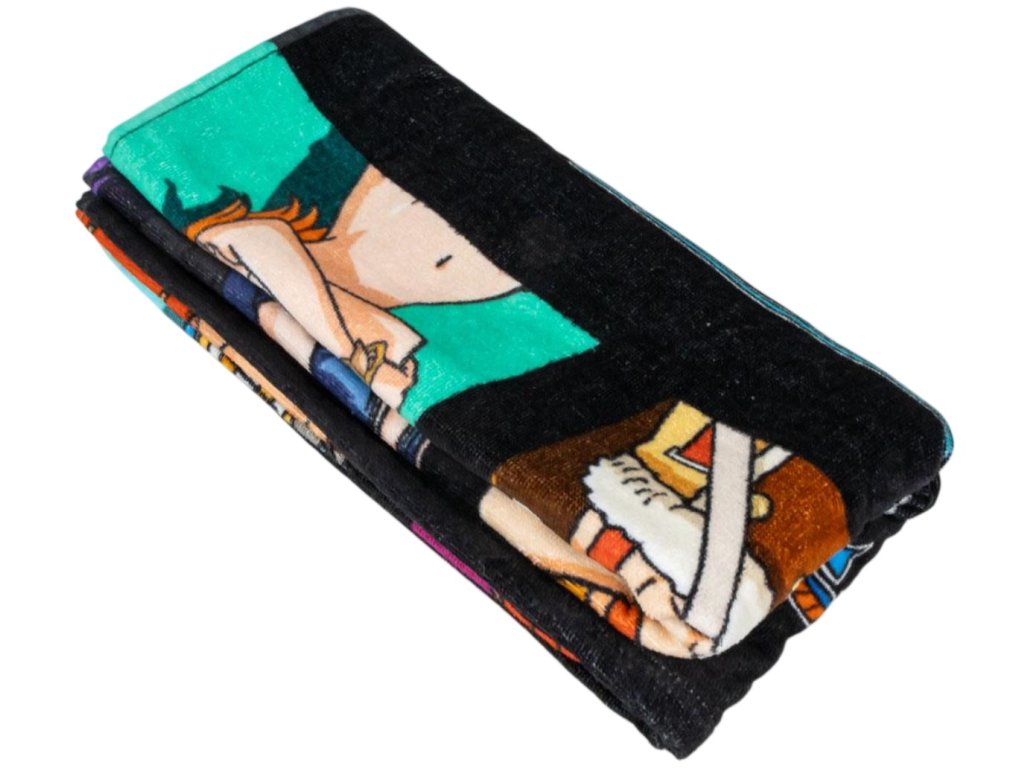 Atraktivní vícebarevný ručník - osuška s grafikou hlavních postav z japonského seriálu One Piece. Ručník je vhodným dárkem pro každého fanouška.