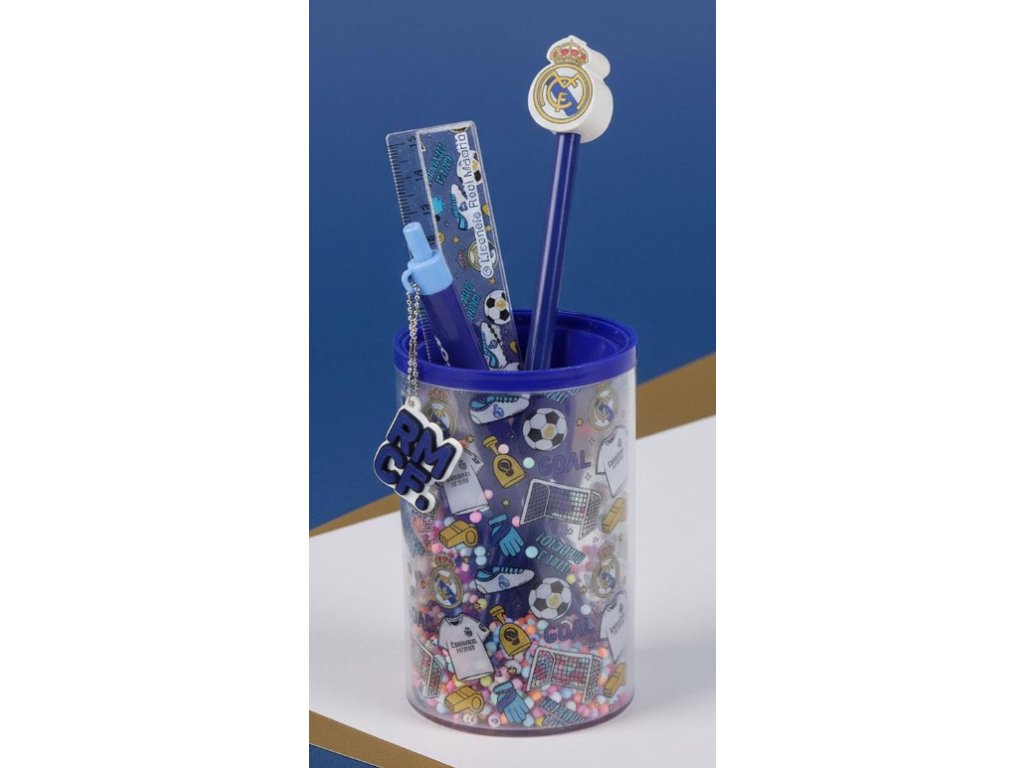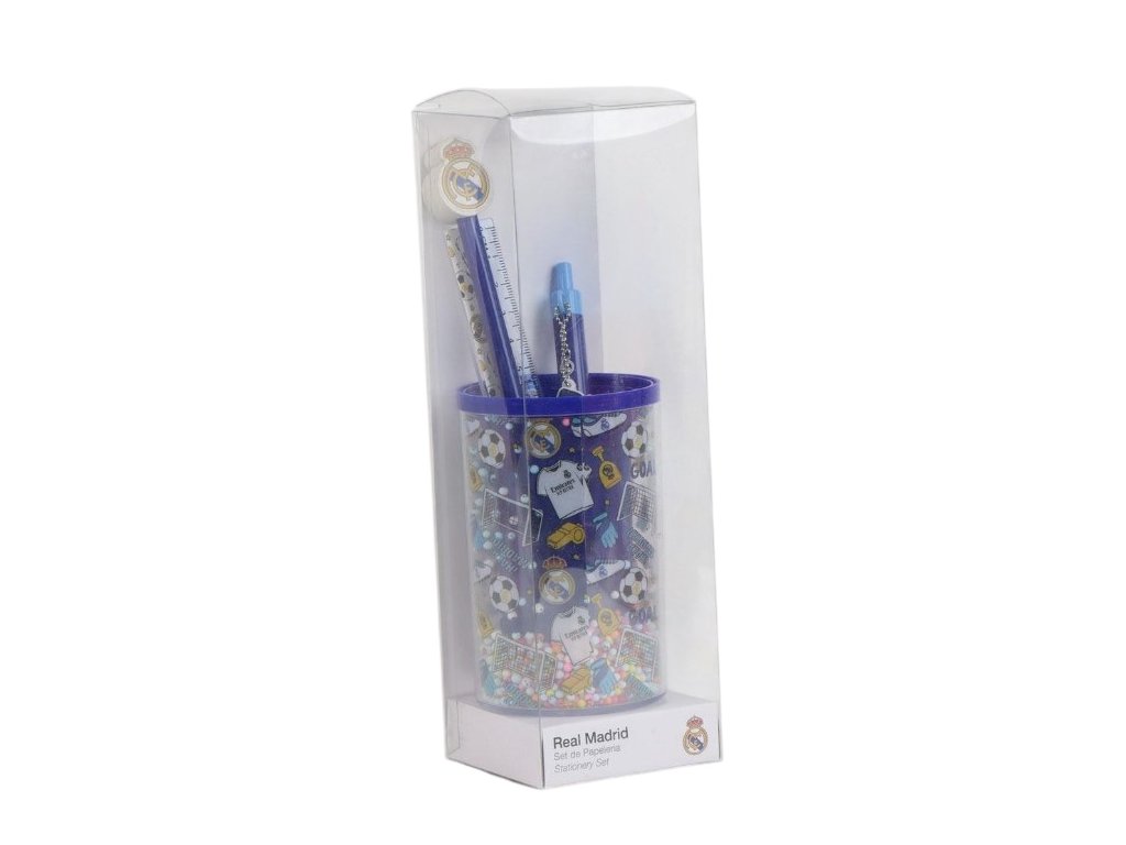 Potřebujete vybavit malého školáka nebo hledáte dokonalý dárek, který vykouzlí úsměv na tváři? Tento praktický set školních pomůcek s motivem znaků a ikon fotbalého klubu Real Madrid je přesně to, co hledáte! Všechny doplňky jsou úhledně naskládány ve stojánku ve stejném designu, takže budou vždy po ruce a v bezpečí - ať už na školní lavici, nebo doma na psacím stolu. S tímto setem bude každé psaní úkolů a poznámek radost! Skvělý dárek pro fotbalové fanoušky klubu Real Madrid.