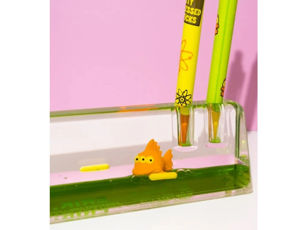 Vneste do svého psaní trochu humoru ze Springfieldu. Tento unikátní tekutý stojánek s legendární tříokou rybkou Blinkym není jen obyčejný držák - je to interaktivní podívaná! Díky speciální směsi vody a oleje rybka uvnitř neustále plave na hladině "radioaktivní" zelené tekutiny. Stačí pohnout stojánkem a sledovat, jak se Blinky mrštně pohybuje. Balení obsahuje stylové kuličkové pero a mechanickou tužku (mikrotužku) na 0,5mm tuhy, obojí v designu inspirovaném seriálem The Simpsons. Stojánek je vyroben z čirého akrylu, zatímco samotná rybka je ručně malovaná figurka z polyresinu. Ulovte si svou vlastní tříokou rybku přímo na pracovní stůl!