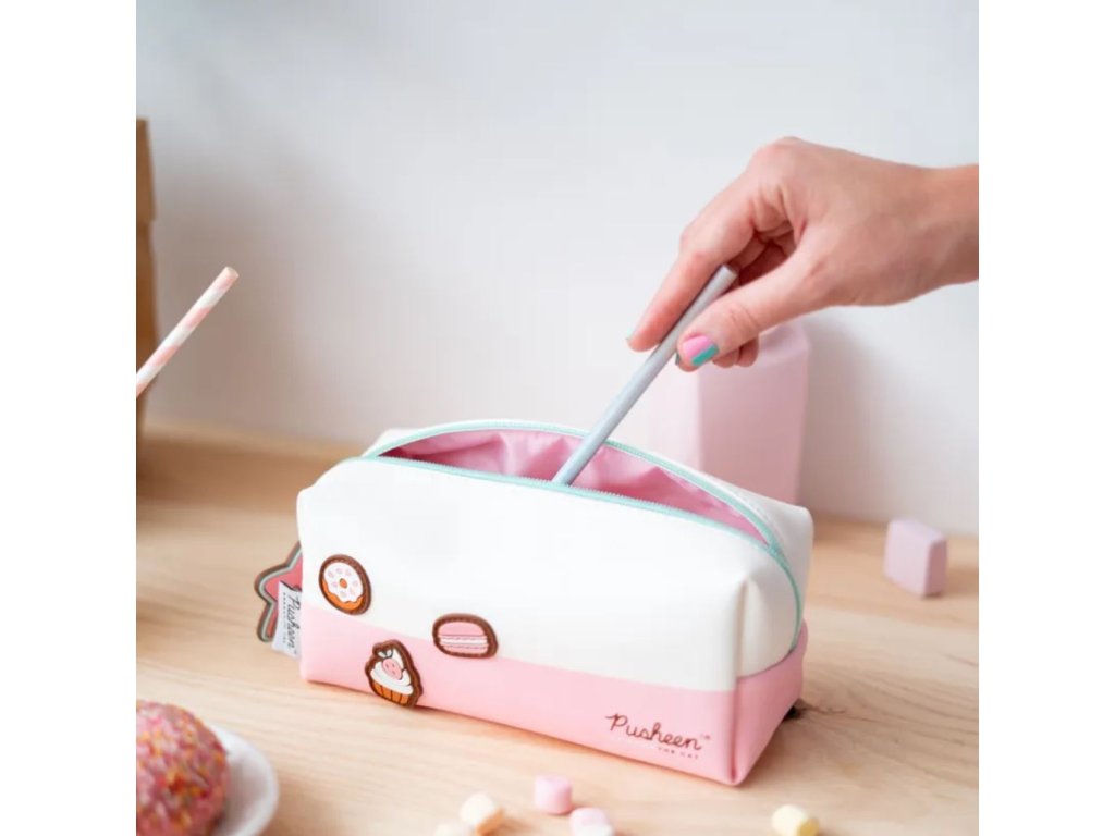 Kosmetická taška v designu kočičího světa Pusheen. Taška má obdélníkový tvar se zapínáním na zip a personalizovaným přívěškem. Je vyrobená z polyesteru se silikonovými nášivkami a měří 23 cm na šířku, přibližně 9 cm na výšku a 7 cm do hloubky. Taštička lze použít i jako penál na tužky, má tak více využití a je tak vhodná i jako dárek pro všechny fanoušky roztomilosti.