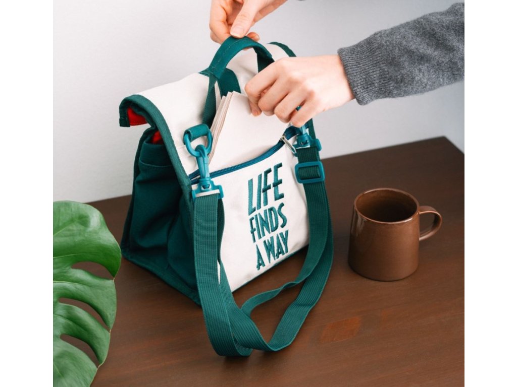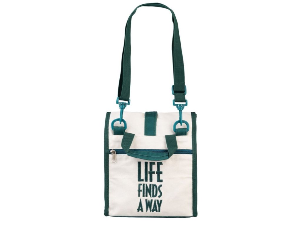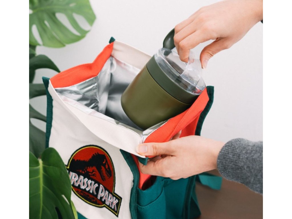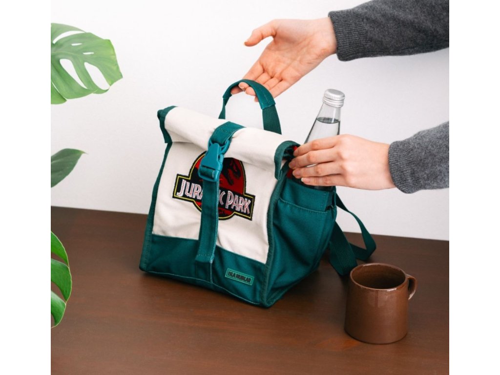 Jednoprostorová béžovo-zelená taška na svačinu s motivem loga známého zábavního parku s dinosaurama - Jurského parku. Taška má izolovanou hliníkovou podšívku pro uchovávání čerstvosti potravin a boční kapsu na láhev. Disponuje také zadní kapsou se zapínáním na zip a uchy jak pro snadné nošení v ruce, tak přes rameno. S touto taškou na svačinu nebudete mít nikdy hlad, protože budete mít svou čerstvou svačinku vždy po ruce.