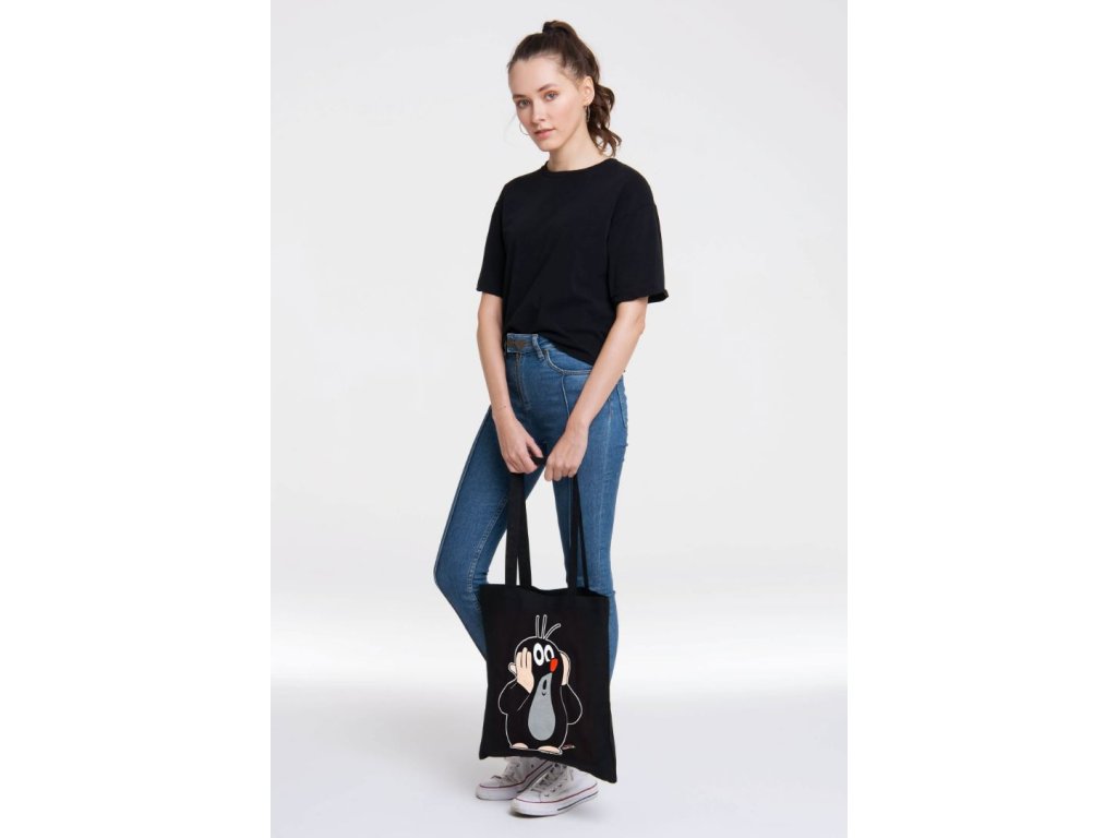 Plátěná taška černé barvy inspirovaná postavičkou Krtečka s údivem: OH! Taška je vhodná nejen na nákupy, ale třeba i do města na každodenní potřeby. Tato atraktivní černá taška je vhodná pro všechny menší i větší fanoušky, kteří chtějí ukázat svou zálibu v Krtečkovi.