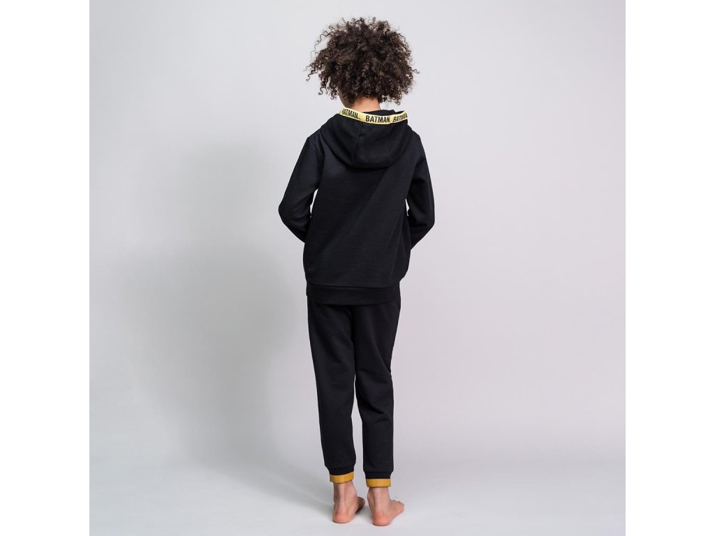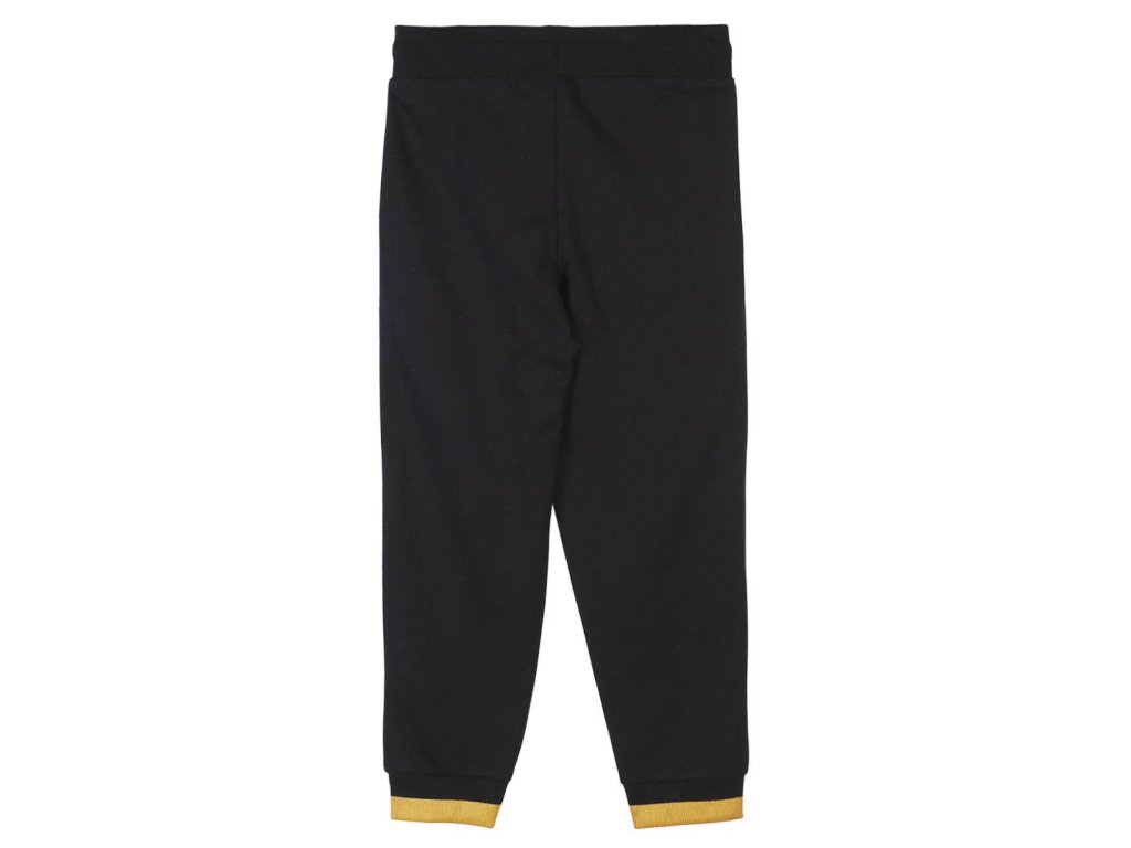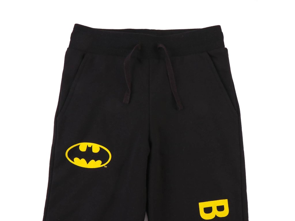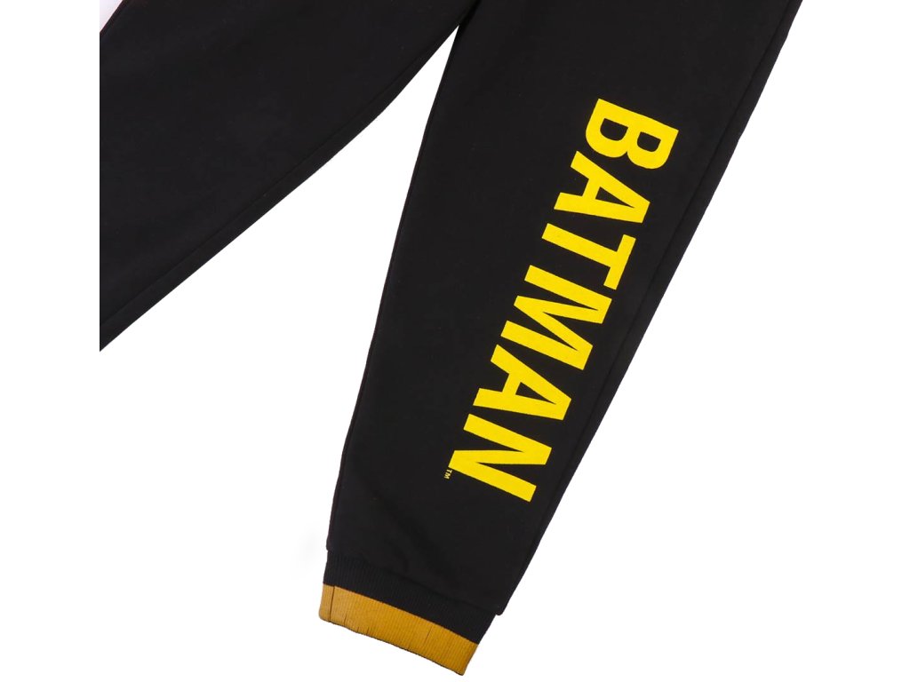 Černé dětské tepláky vyvedené s grafikou žlutého symbolu Batmana a žlutého nápisu: ,,Batman''. Tepláky jsou vhodným doplňkem každého fanouška, který se odteď nebude stydět zachraňovat město i po domácku.