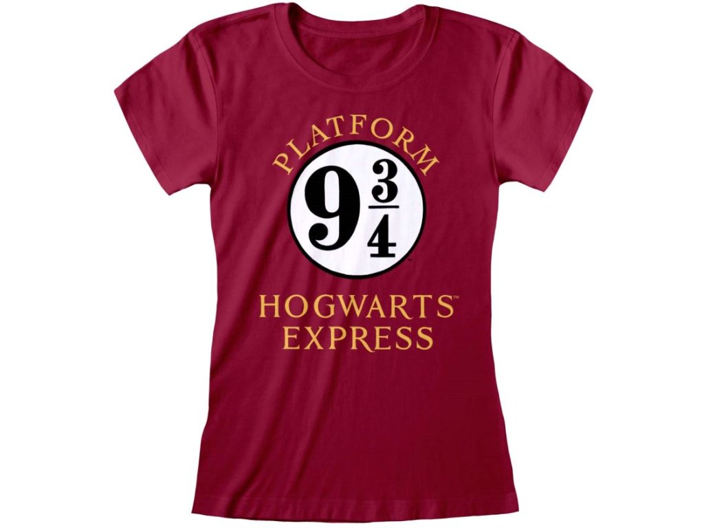Atraktivní červené dámské tričko s krátkým rukávem a grafikou kouzelného nástupiště 9 a 3/4, kde studenti chodili aby se dostali ke slavnému Bradavickému Expresu.