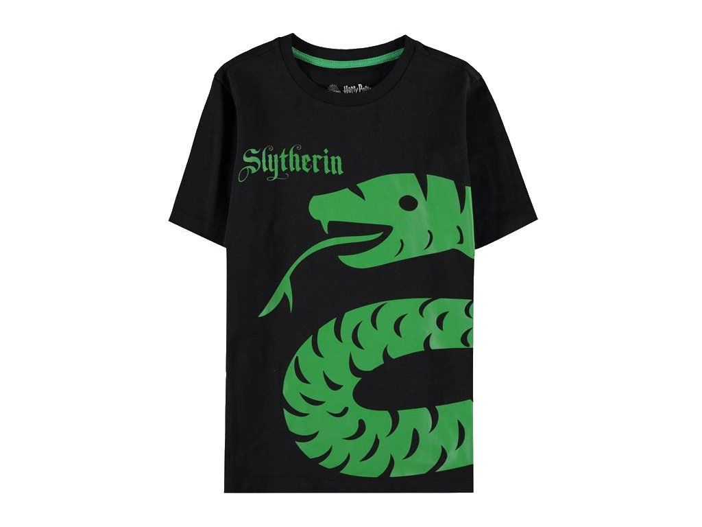 Černé dětské triko s krátkým rukávem a motivem hada, jako znak školní koleje Zmijozel.