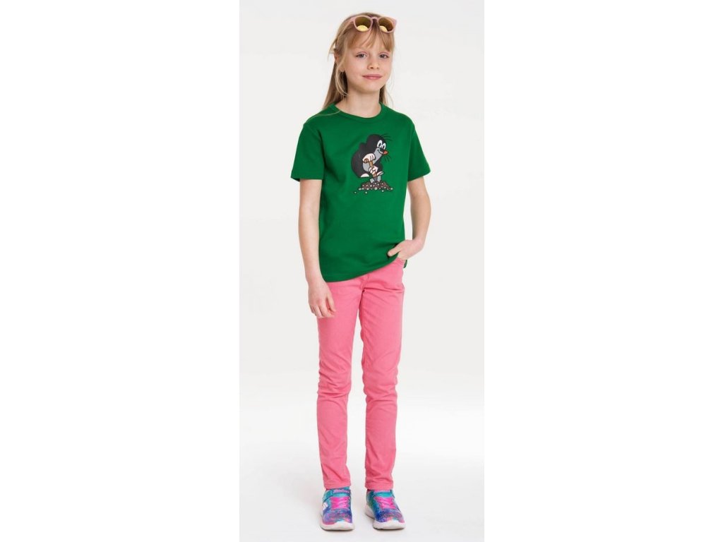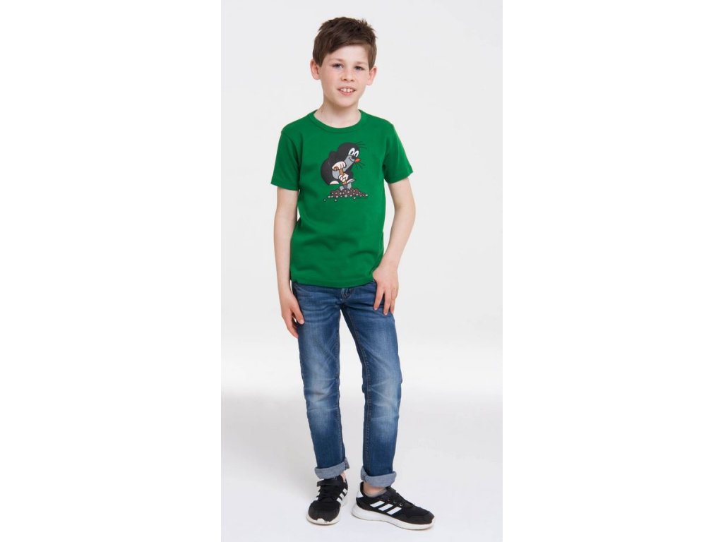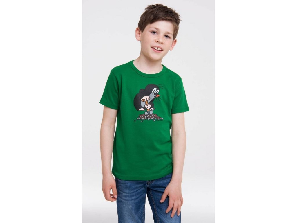 Zelené dětské tričko s grafickým potiskem Krtečka s rýčem. Tričko je vhodné pro všechny menší i větší fanoušky této pohádky.