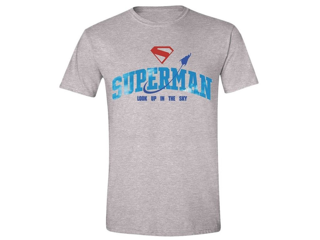 Šedé pánské tričko s krátkým rukávem s grafikou nápisu superhrdiny Supermana, nápisem: ,,Look up in the sky'' a jeho logem. Tričko je vhodným dárkem například ke dni otců, kdy chcete ukázat, že pro vás je největší superhrdina váš táta.