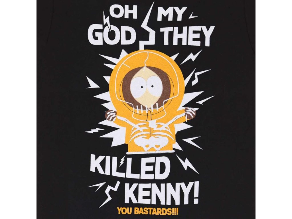 Atraktivní černé pánské tričko s krátkým rukávem s grafikou Kennyho a nápisem: ,,Oh my God, they killes Kenny!" z komediálního animovaného seriálu Městečko South Park. Tričko je vhodné pro každého fanouška, jedné z nejvýznamnějších postav, Kennyho McCormicka.