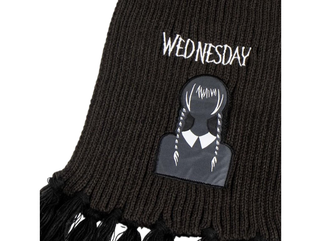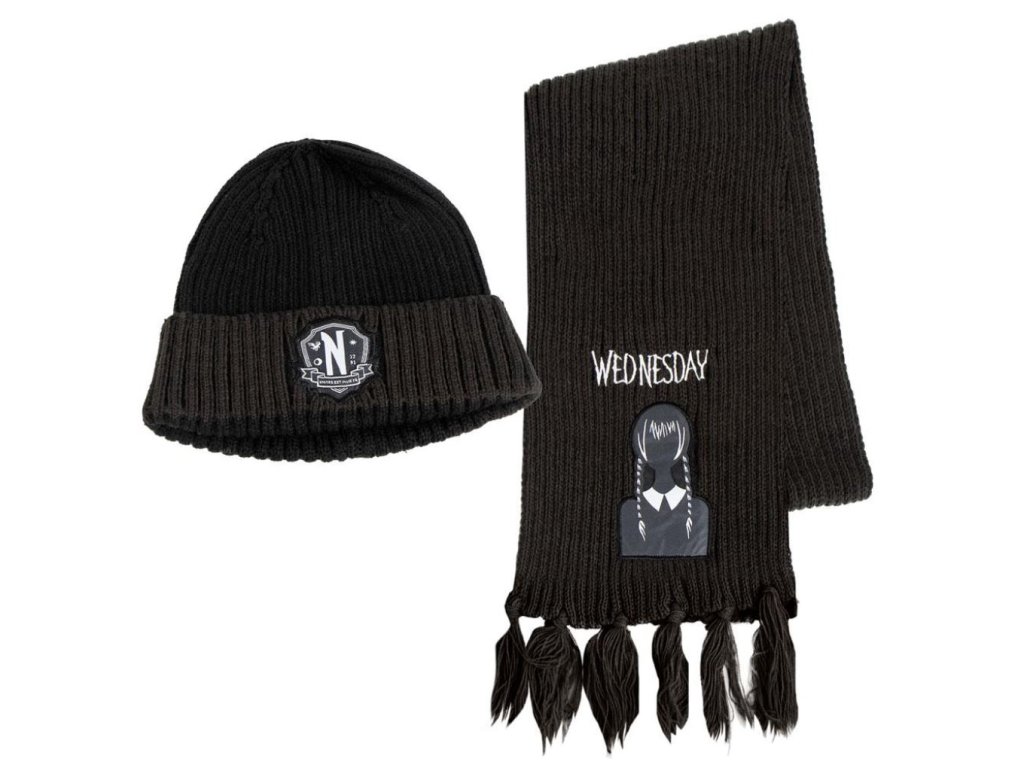 Oficiální produkt - zimní set, čepice a šály, z katalogu fashion výrobků s grafikou a licencí populárního seriálu Wednesday od společnosti Netflix.